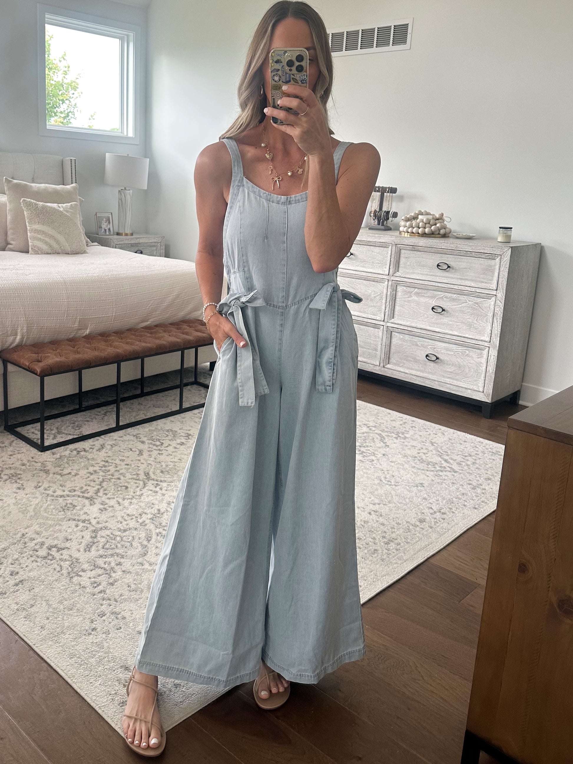 Sleevesless denim jumpsuit with bow detail + pockets. Adjustable straps. True to size fit. Brooke is 5'10, size 4, wearing a small.