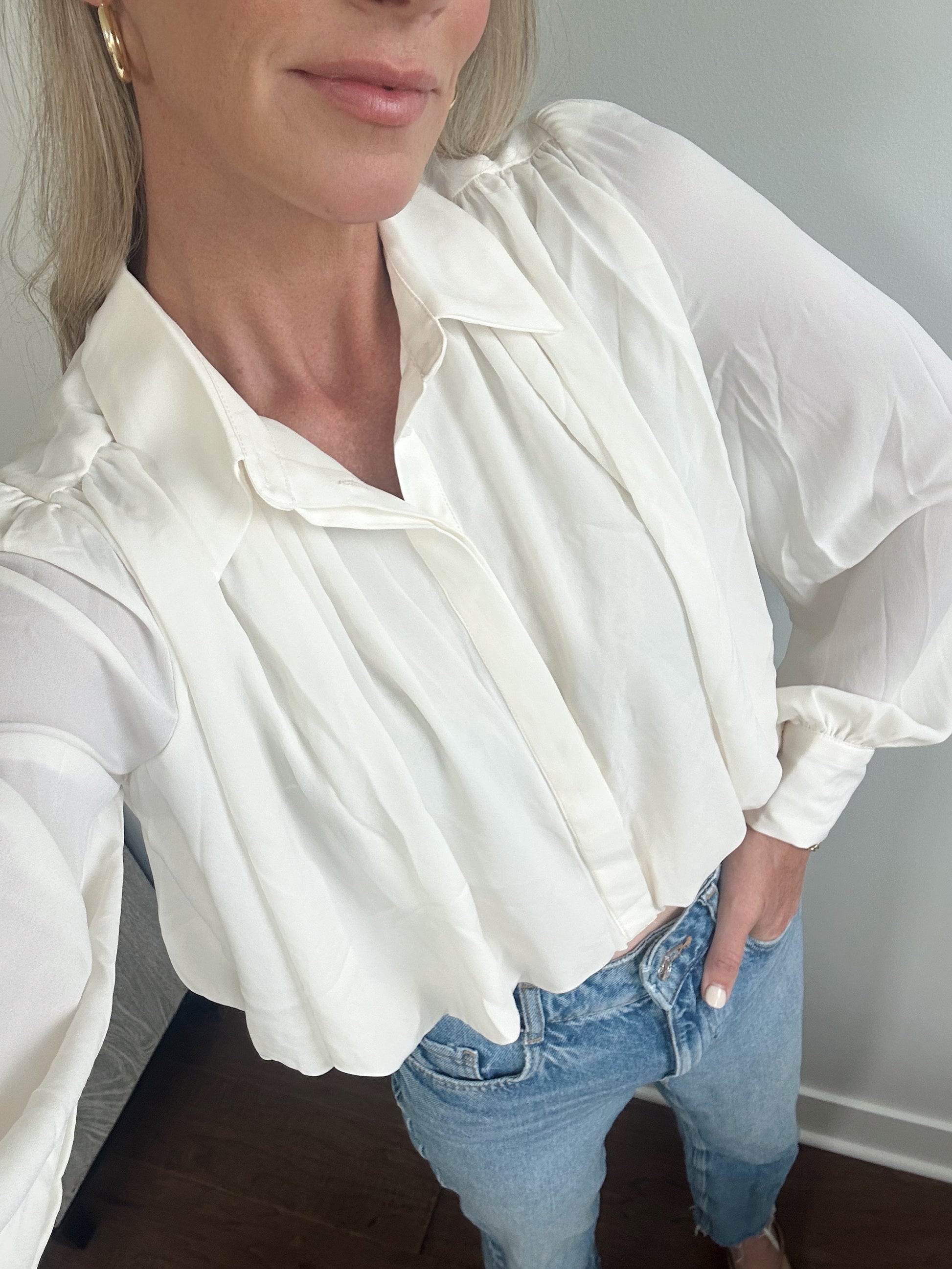 Bubble hem chiffon button down top. True to size flowy fit. Brooke is 5'10, a size 4 and shown in a small.