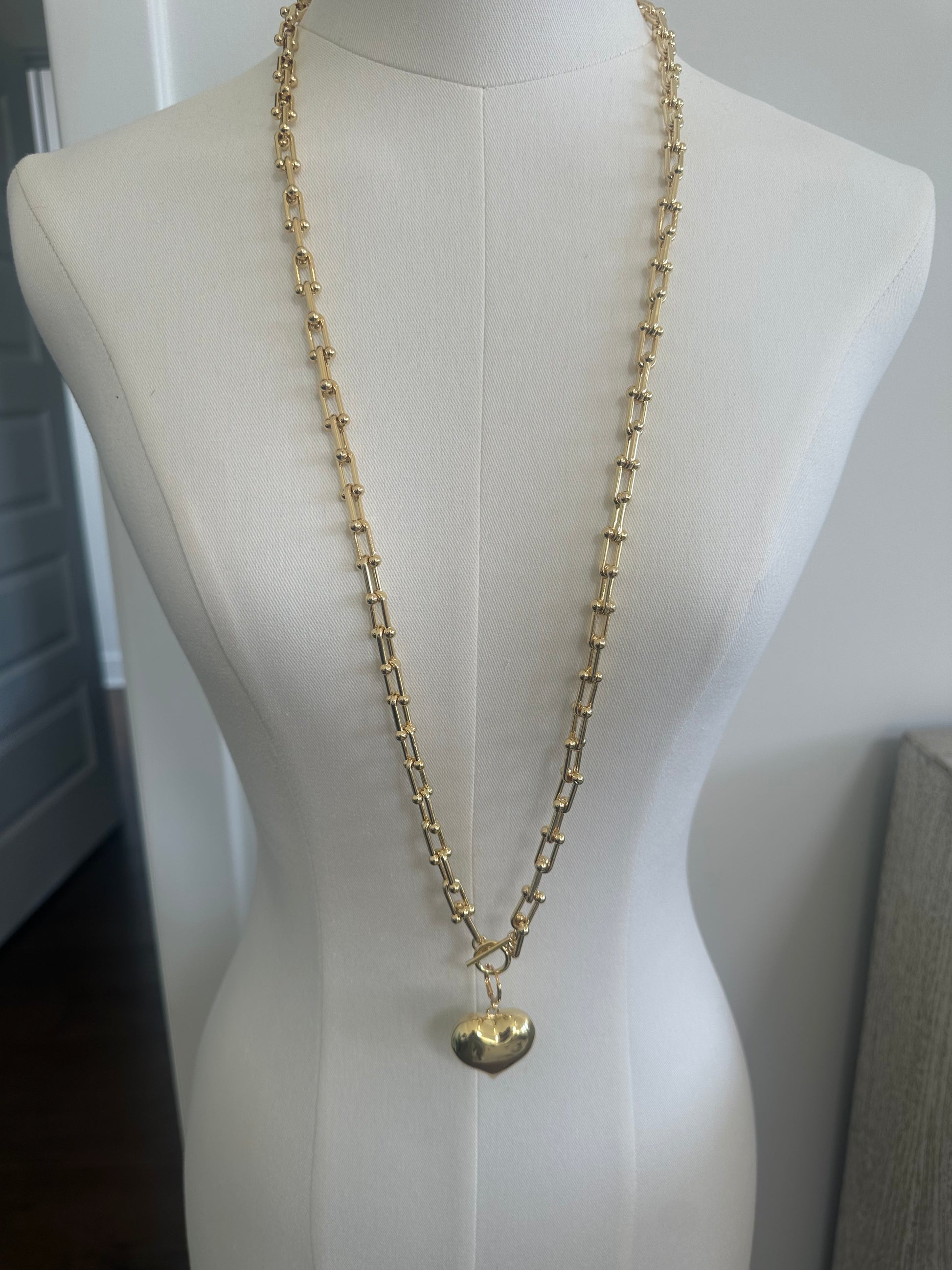 Long gold necklace with chunky heart charm and lobster clasp closure. Final sale