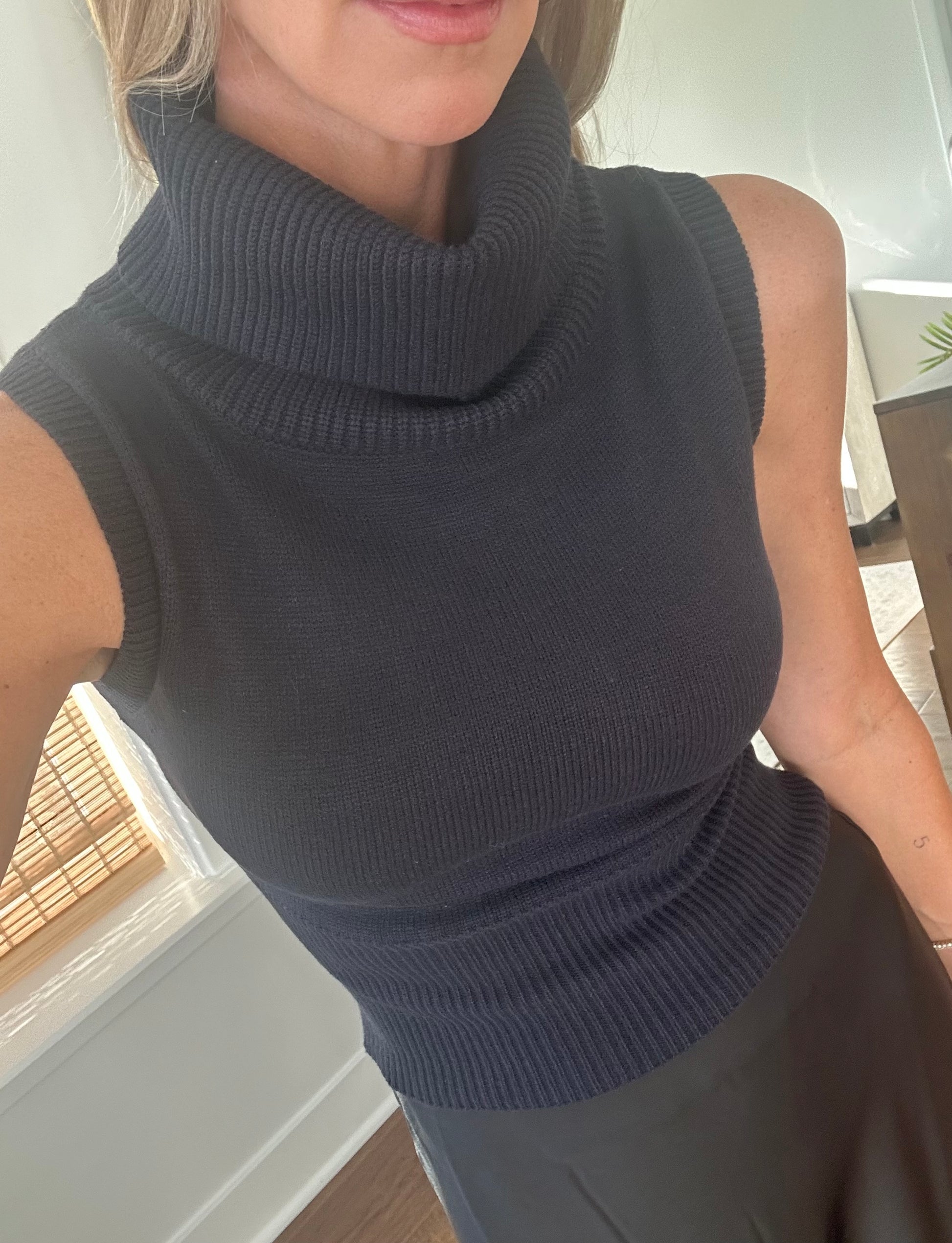 Stretchy cowl neck sweater tank. True to size stretchy fit. Zero itch. Brooke is a size 4, 5'10, and shown in a small.