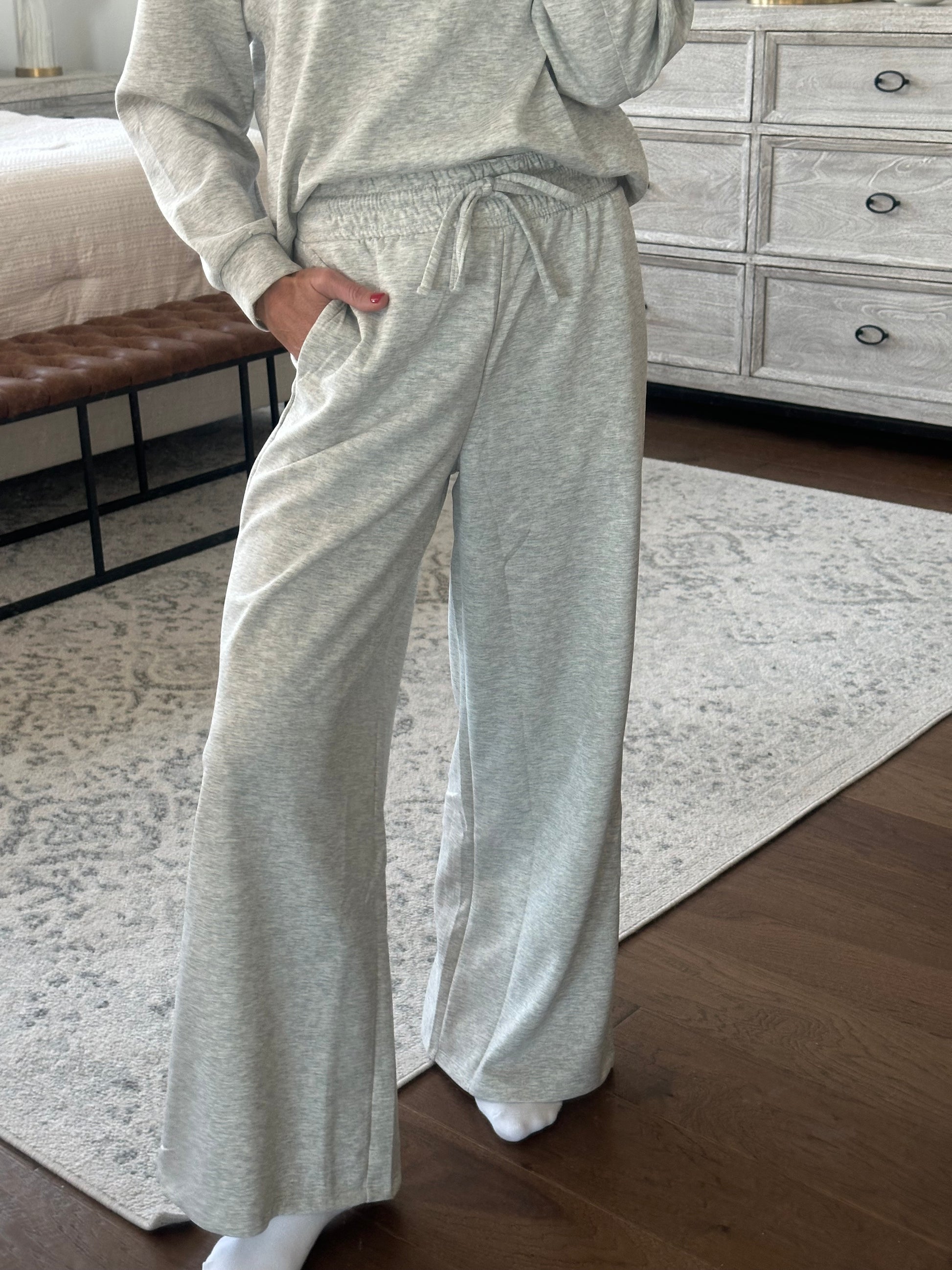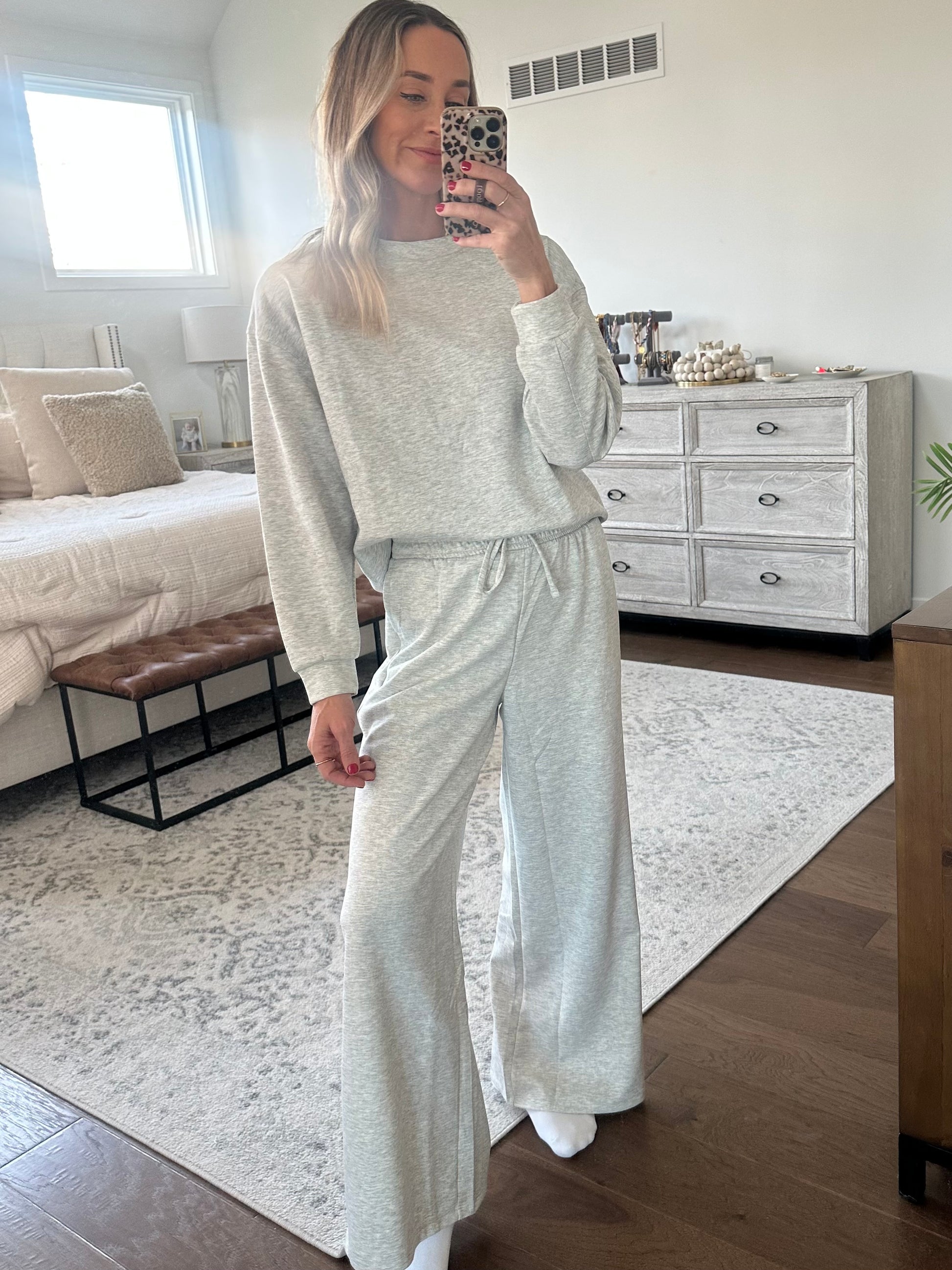 Ultra soft crew neck sweatshirt and sweatpants. The pants have a stretchy, adjustable tie waist + pockets. Brooke sized up to a medium for a roomier fit, but the fit is true to size.
