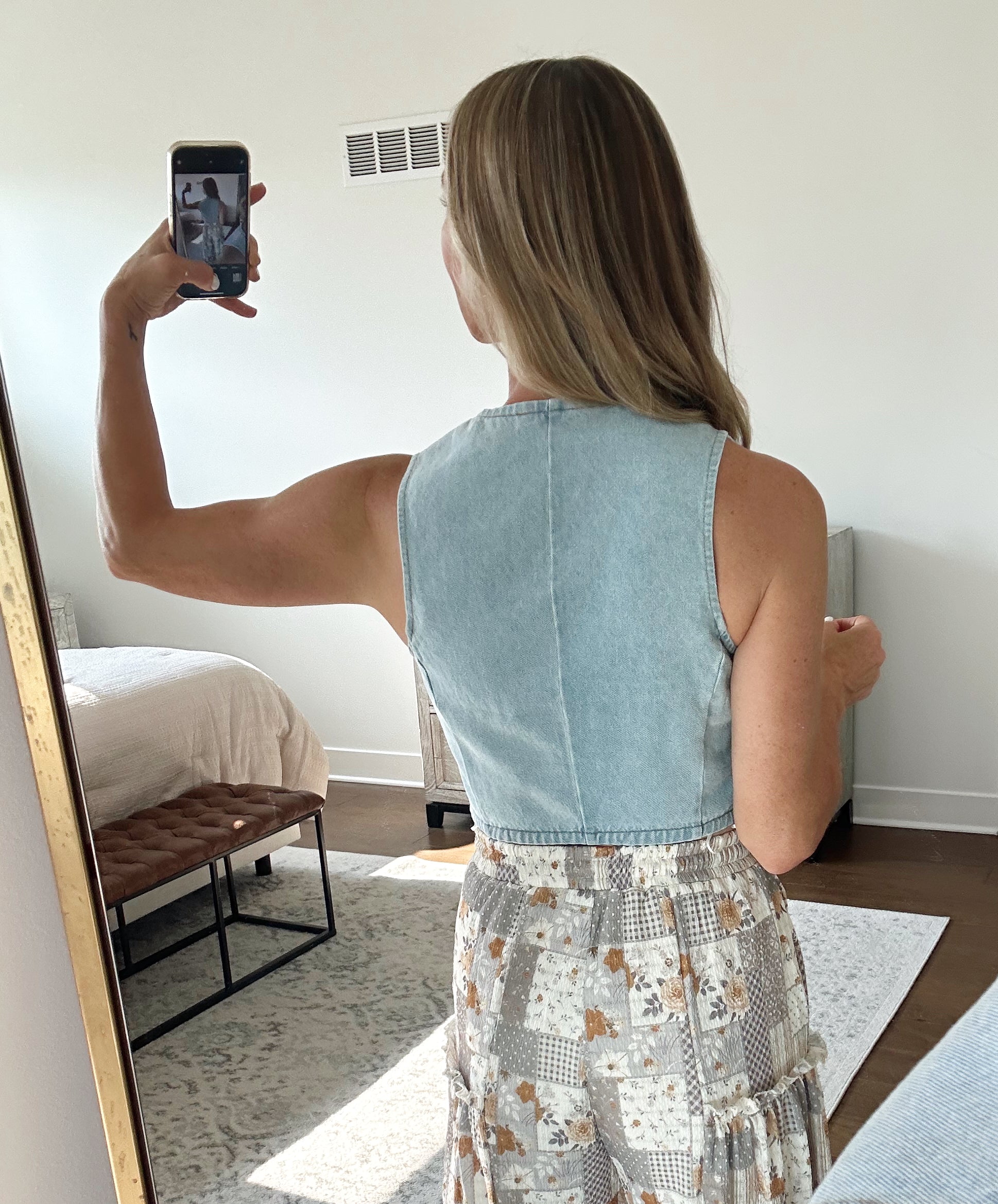 Light weight denim vest with functional buttons and a movable feel. This can be worn as a top or a layering piece. Brooke is 5'10, a size 4, and shown wearing a small.