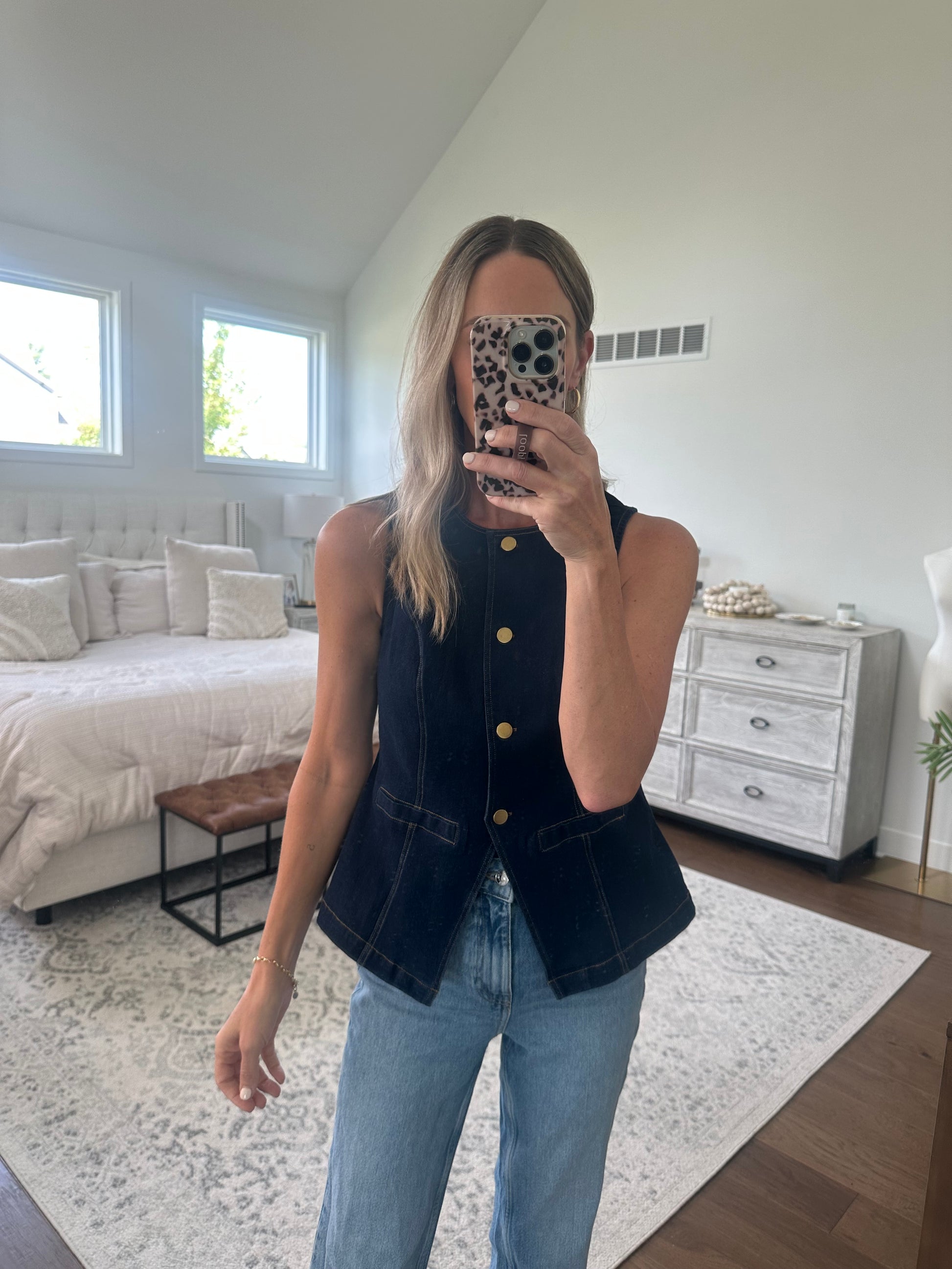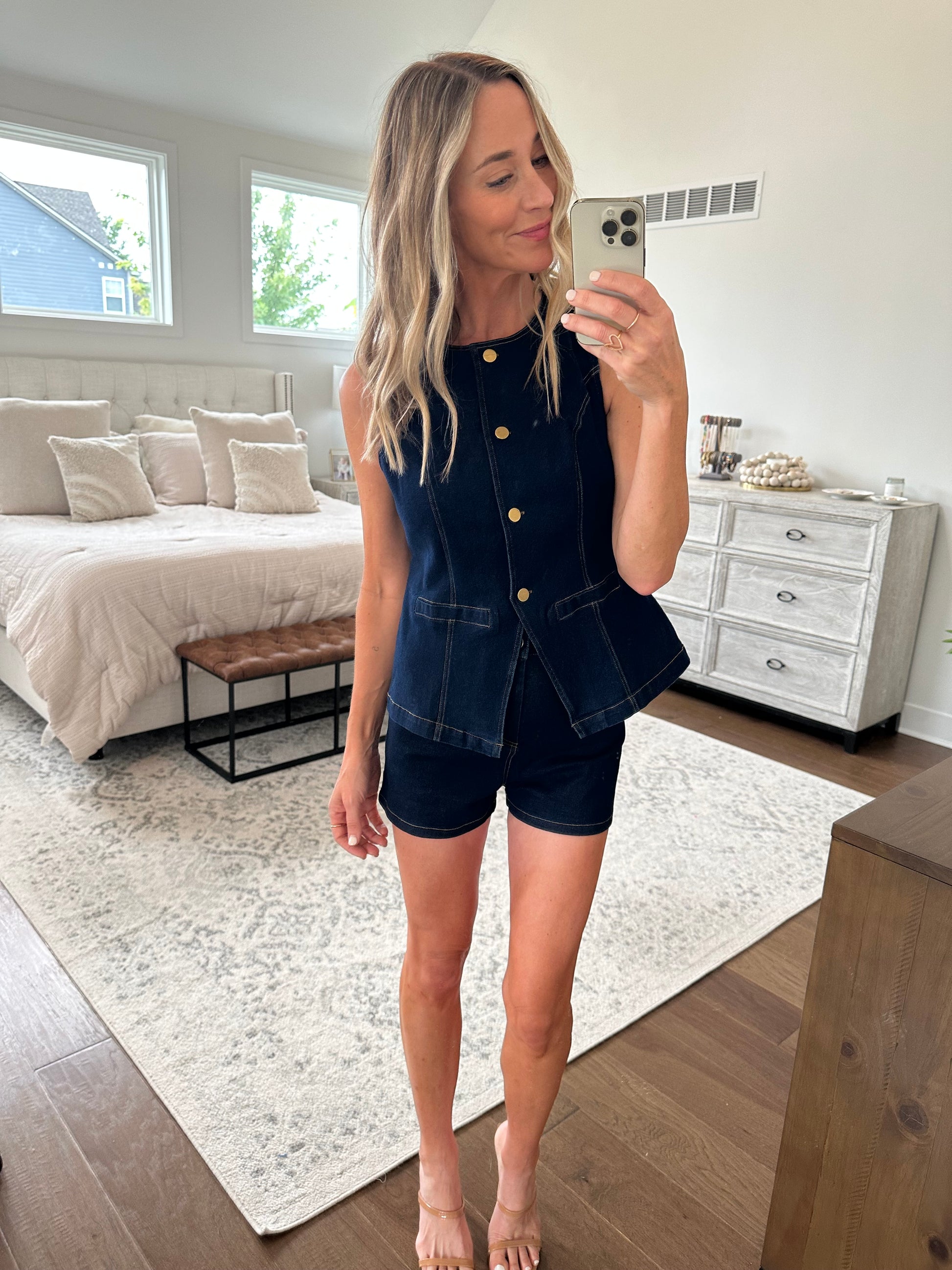 Stretchy dark denim vest. Size down if you are between sizes. Brooke is 5'10, a size 4, and shown wearing a small. Shorts sold separately.