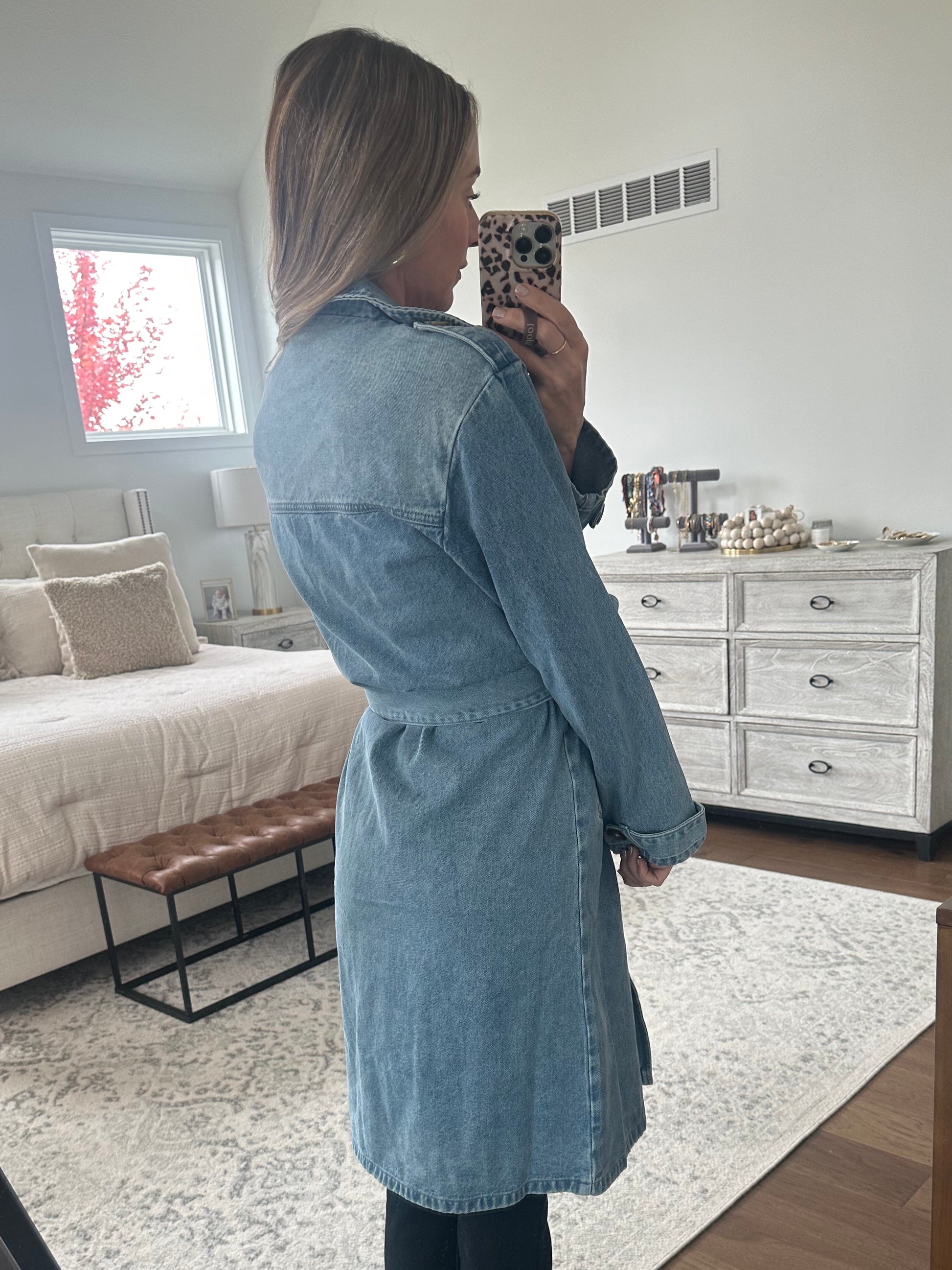 Belted denim trench coat with functional buttons and pockets. True to size fit. Brooke is a size 4, 5'10, and shown in a small.