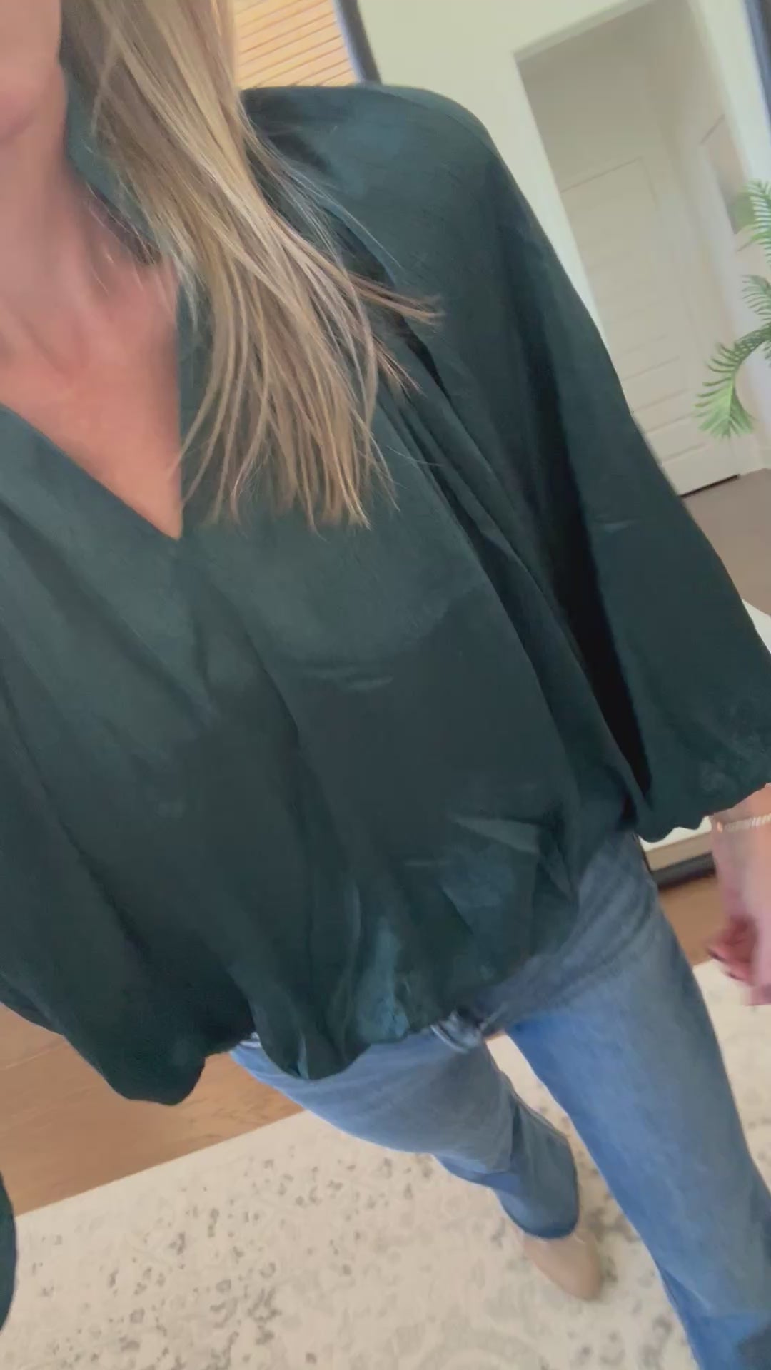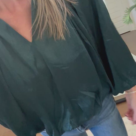 Satin top with full stretchy sleeves and bubble hem. True to size. Brooke is a size 4, 5'10, and shown in a small.