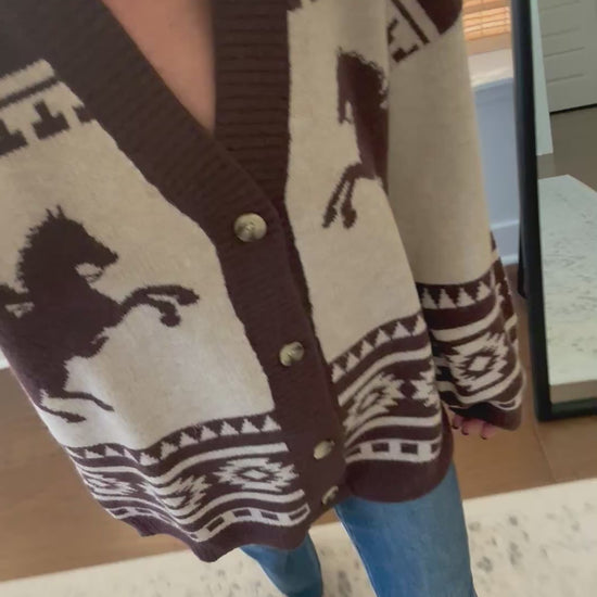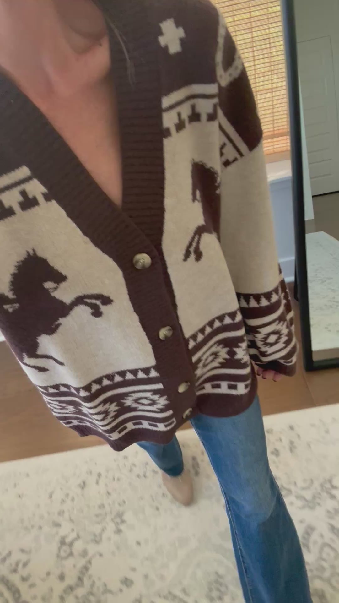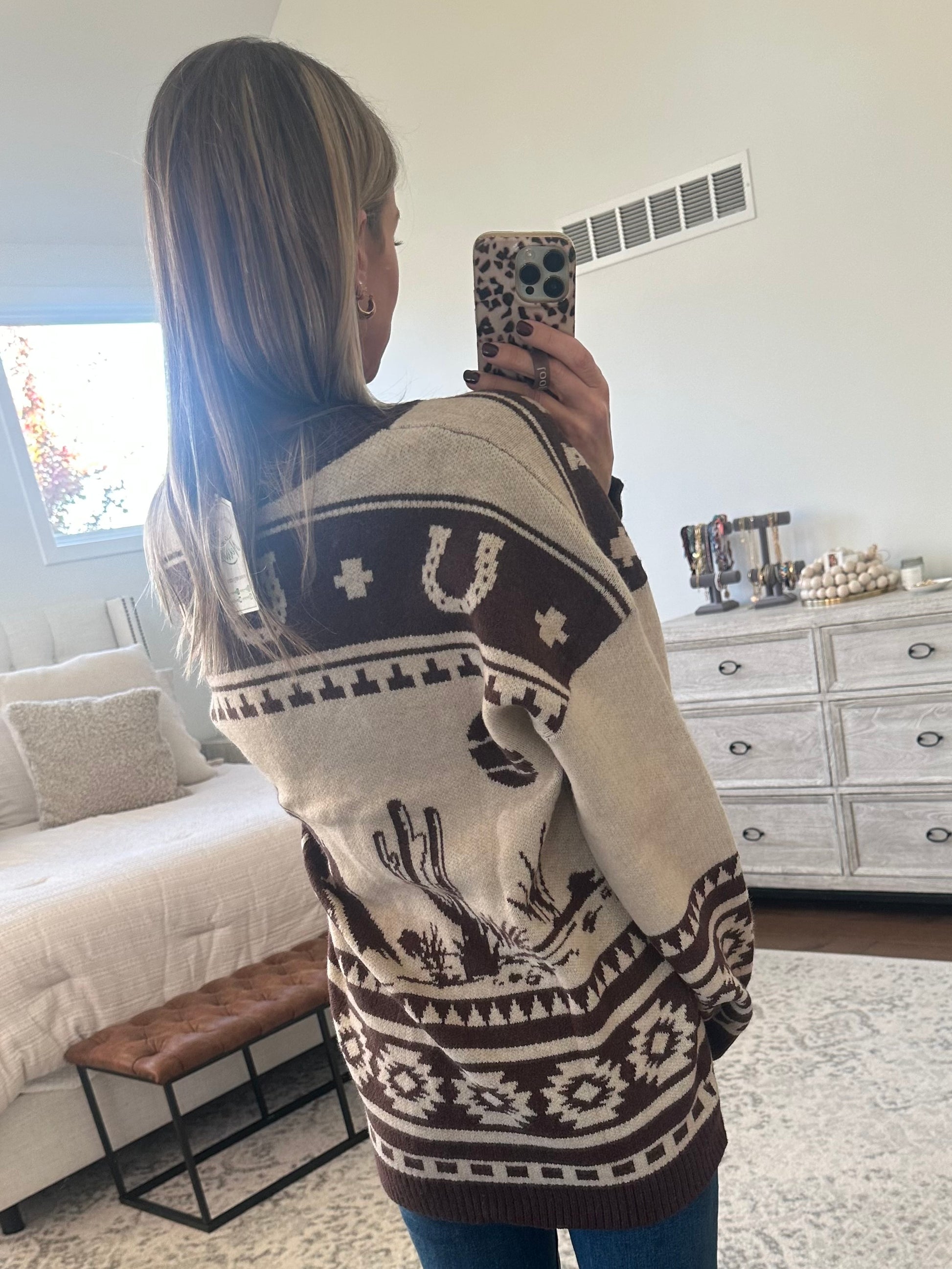 TRENDING print! Taupe cardigan with chocolate brown detail. Full sleeves and functional buttons. Relaxed, oversized fit. Brooke is a size 4, 5'10, and shown in a small.