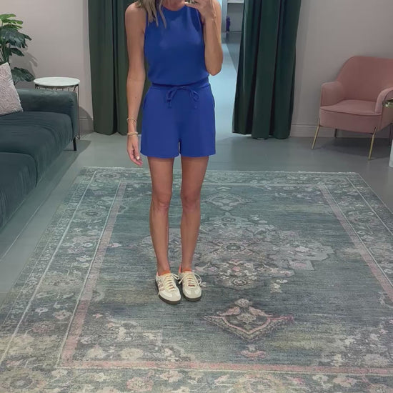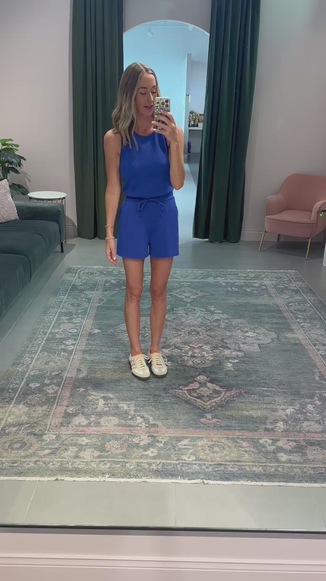 This romper has a relaxed fit, stretchy waist band with an adjustable drawstring, and pockets. It's made of a soft rayon/poly/spandex fabric and runs true to size.