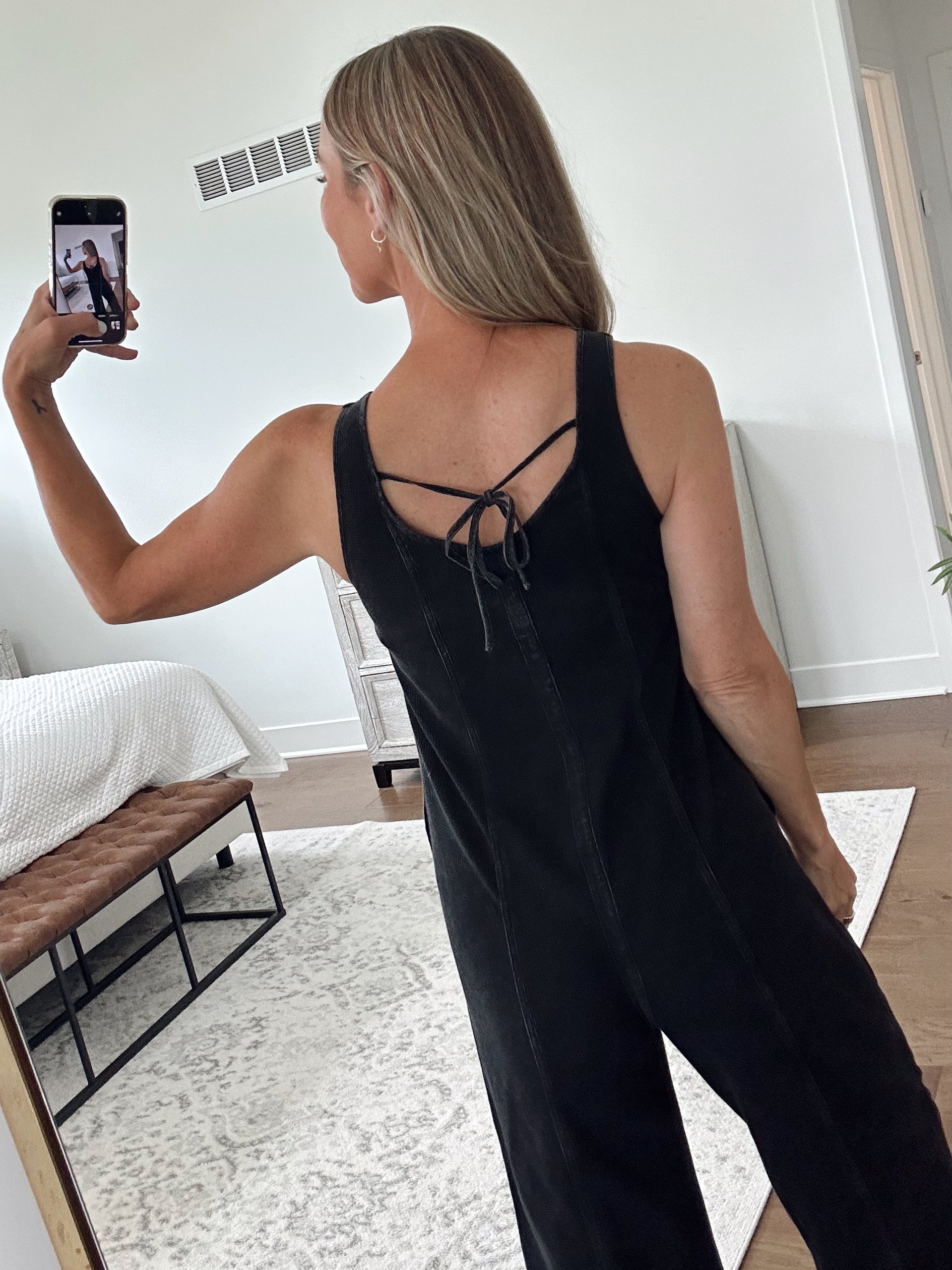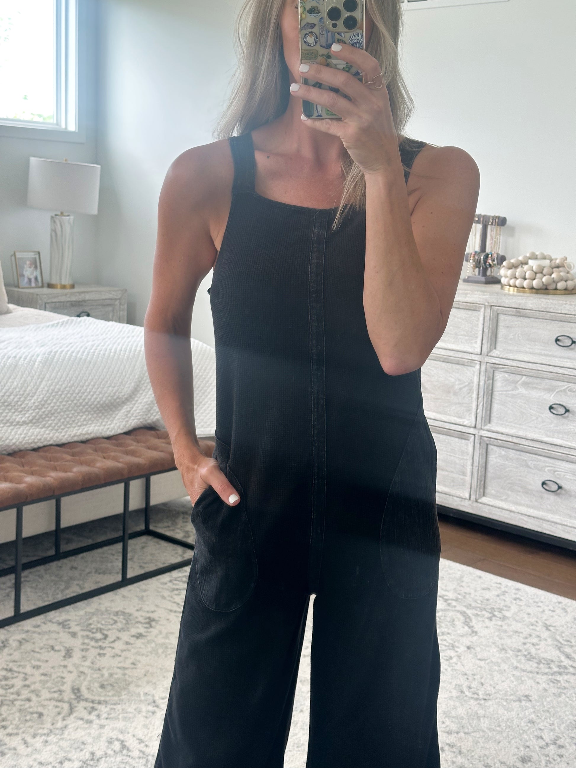 Tank jumper with tie back detail and pockets. Size up if you are between sizes for a more flowy fit. Brooke is 5'10, size 4, and shown in a small.