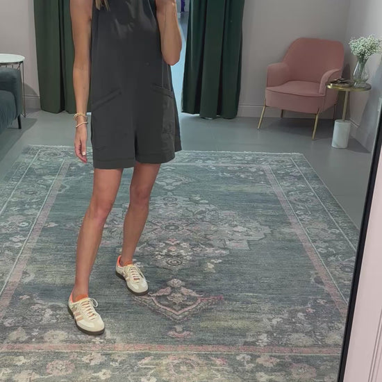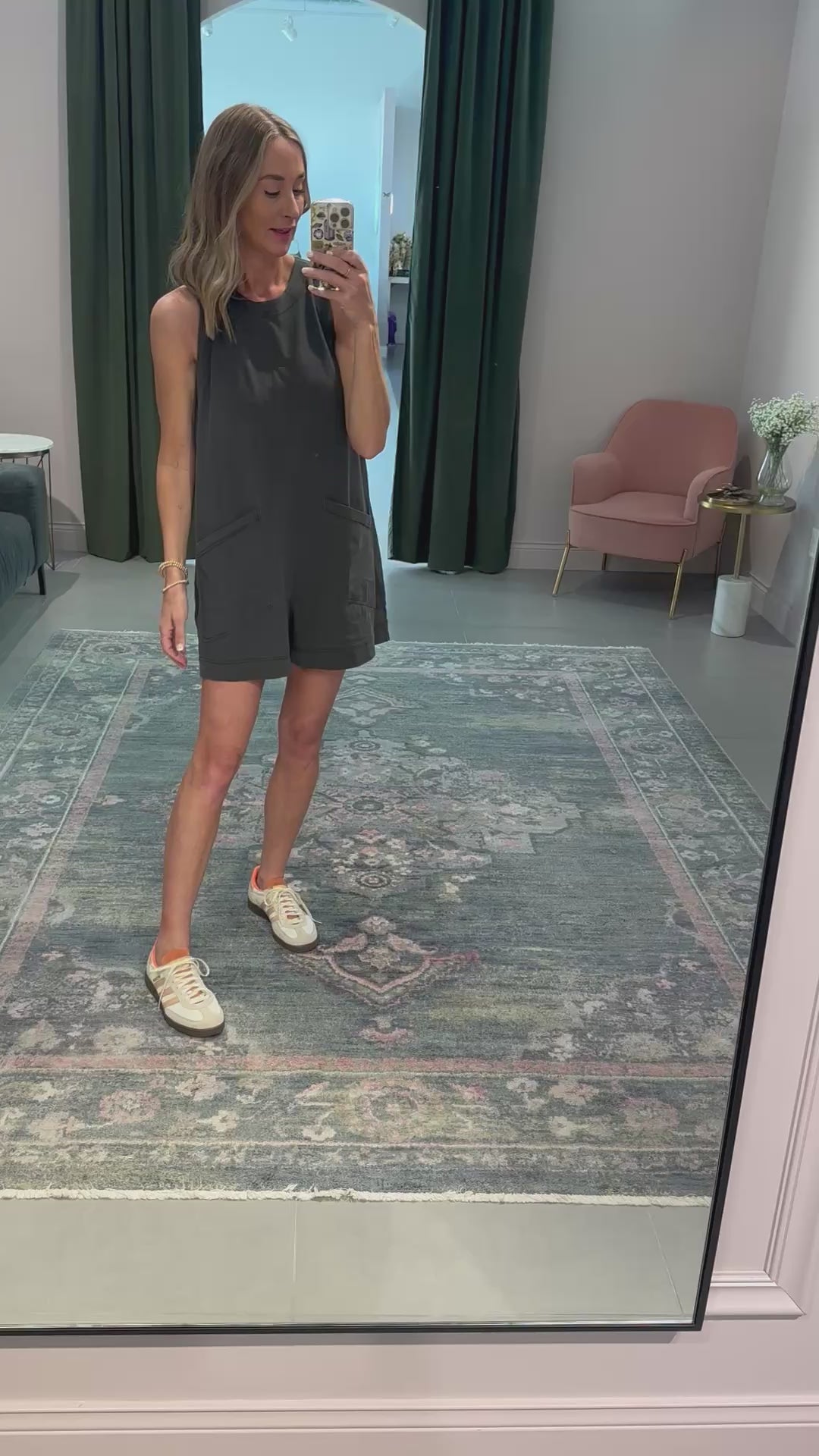Relaxed fit romper with deep front pockets. This style runs true to size and is made of a soft 100% cotton fabric.