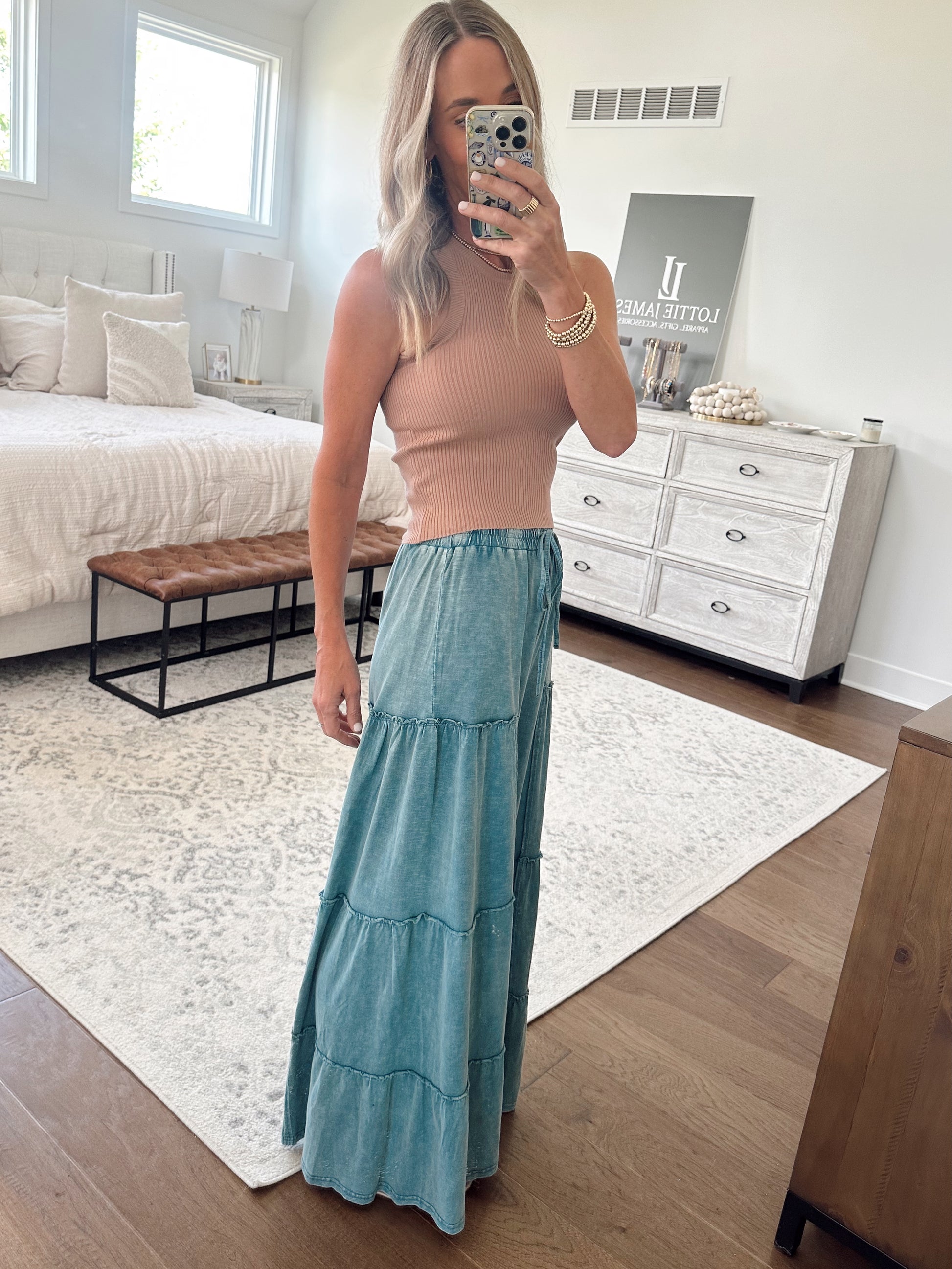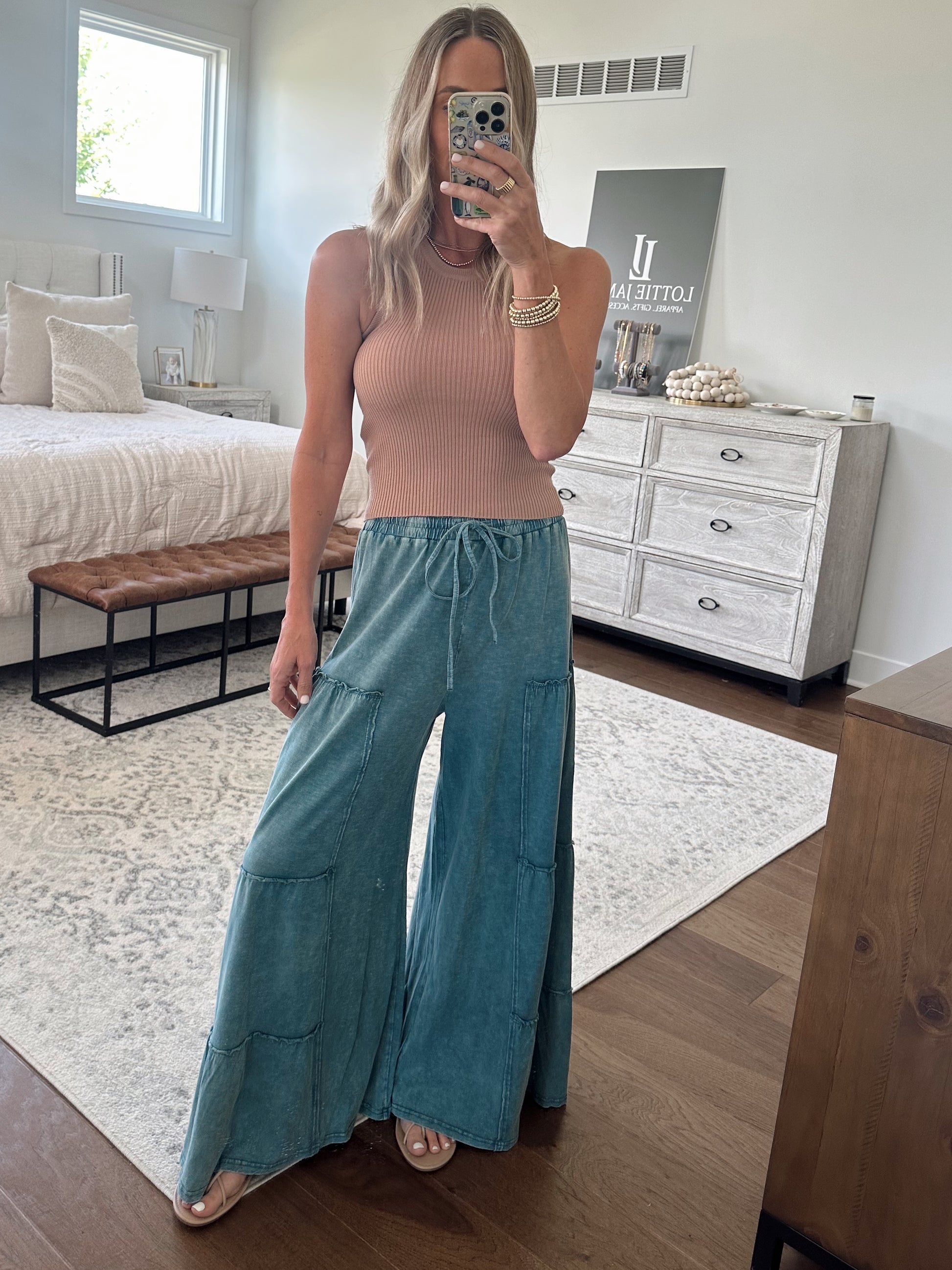 Wide flare leg pant with mineral wash, stretchy adjustable waist, and pockets.