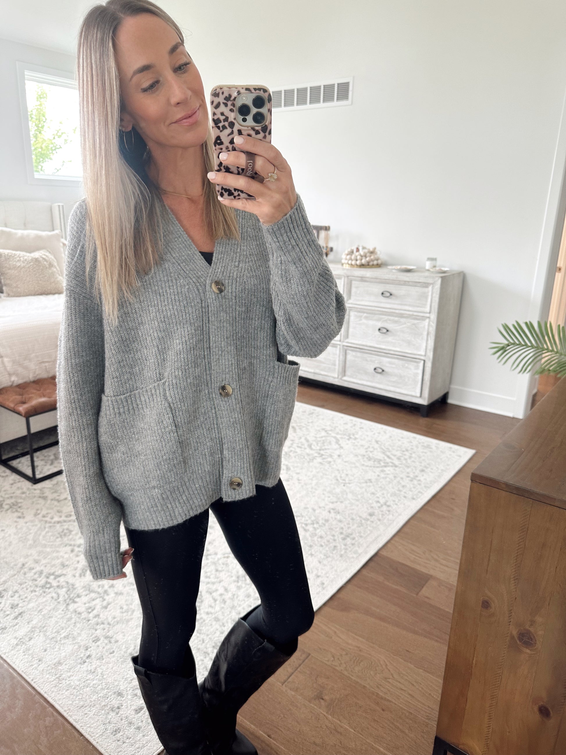 Soft long sleeve sweater cardigan with functional buttons. Oversized slouchy fit. Made of softly/acrylic/spandex blend fabric. The fit is meant to be oversized. Brooke is a size 4. 5'10, and wearing a small.