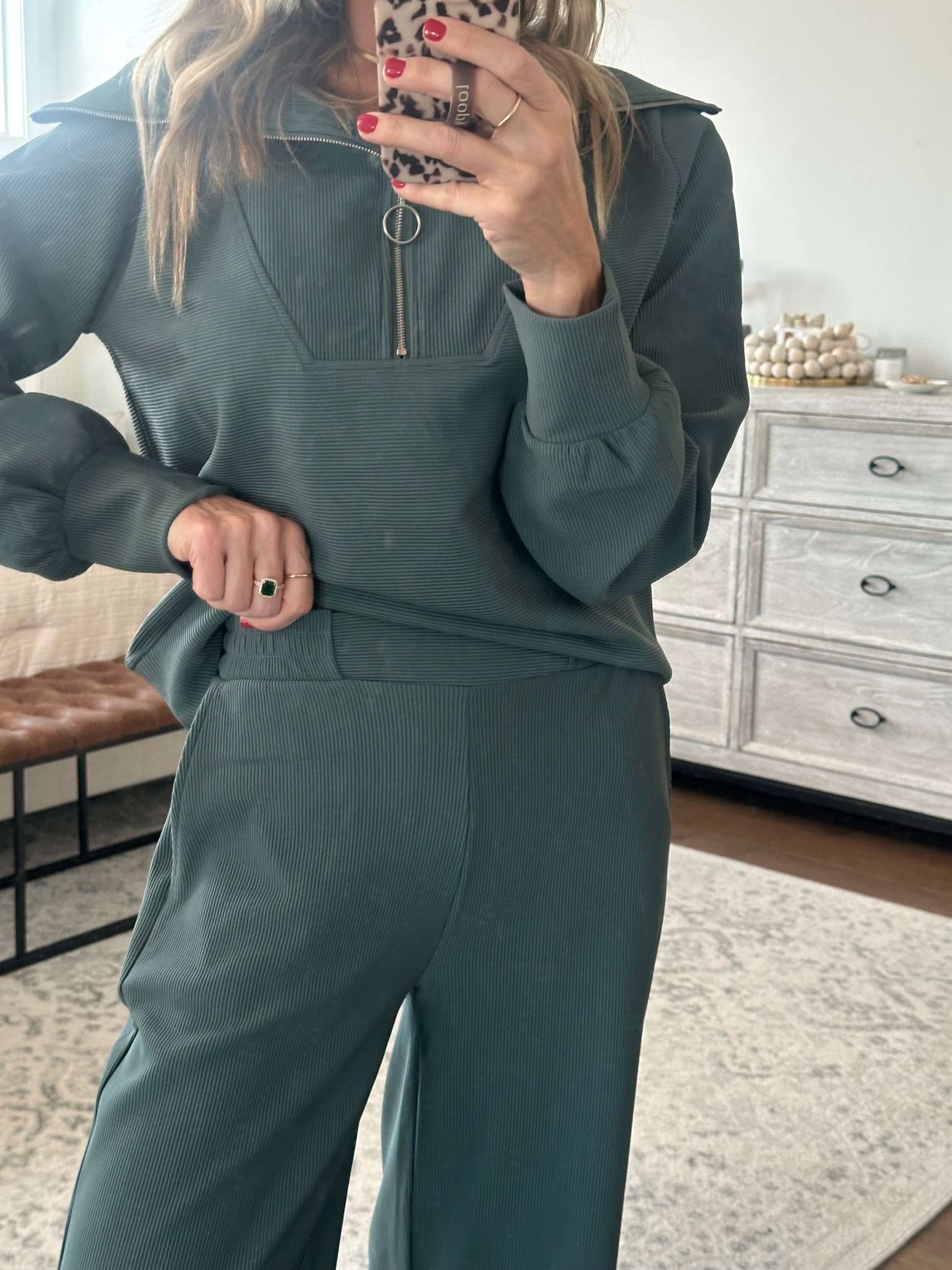 Half zip set with ribbed fabrication and relaxed true to size fit. The pants have a stretchy elastic waist, wide leg, and pockets. Brooke is a size 4, 5'10, and shown in a small.
