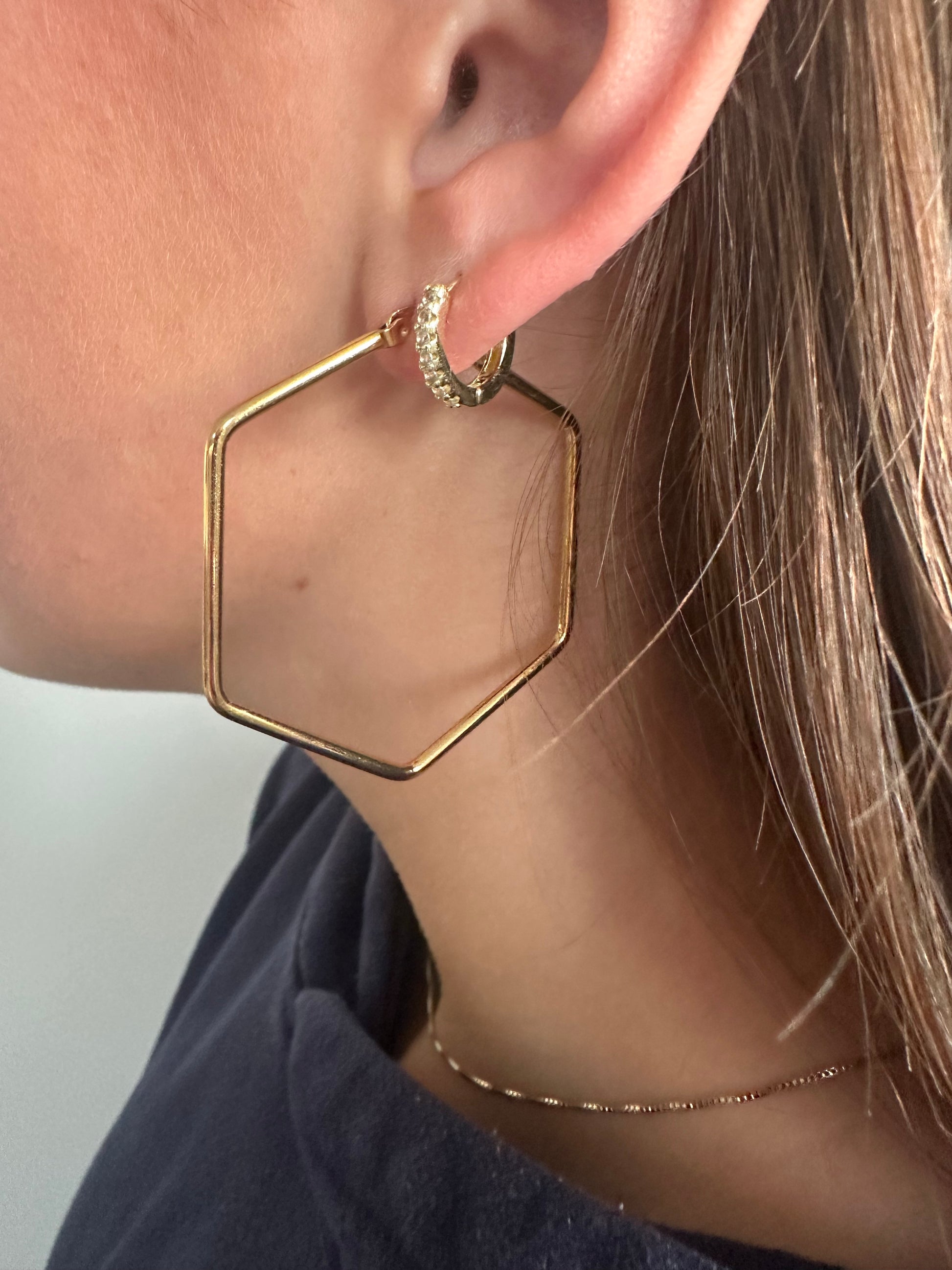 Hexagon earrings. Gold plated. Light weight. Tarnish free. Nickel free.