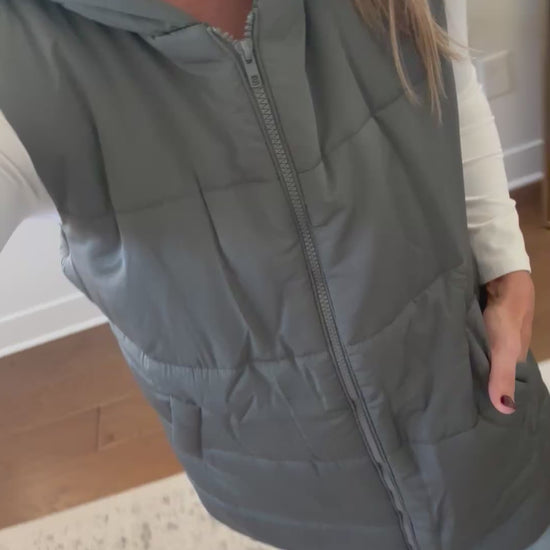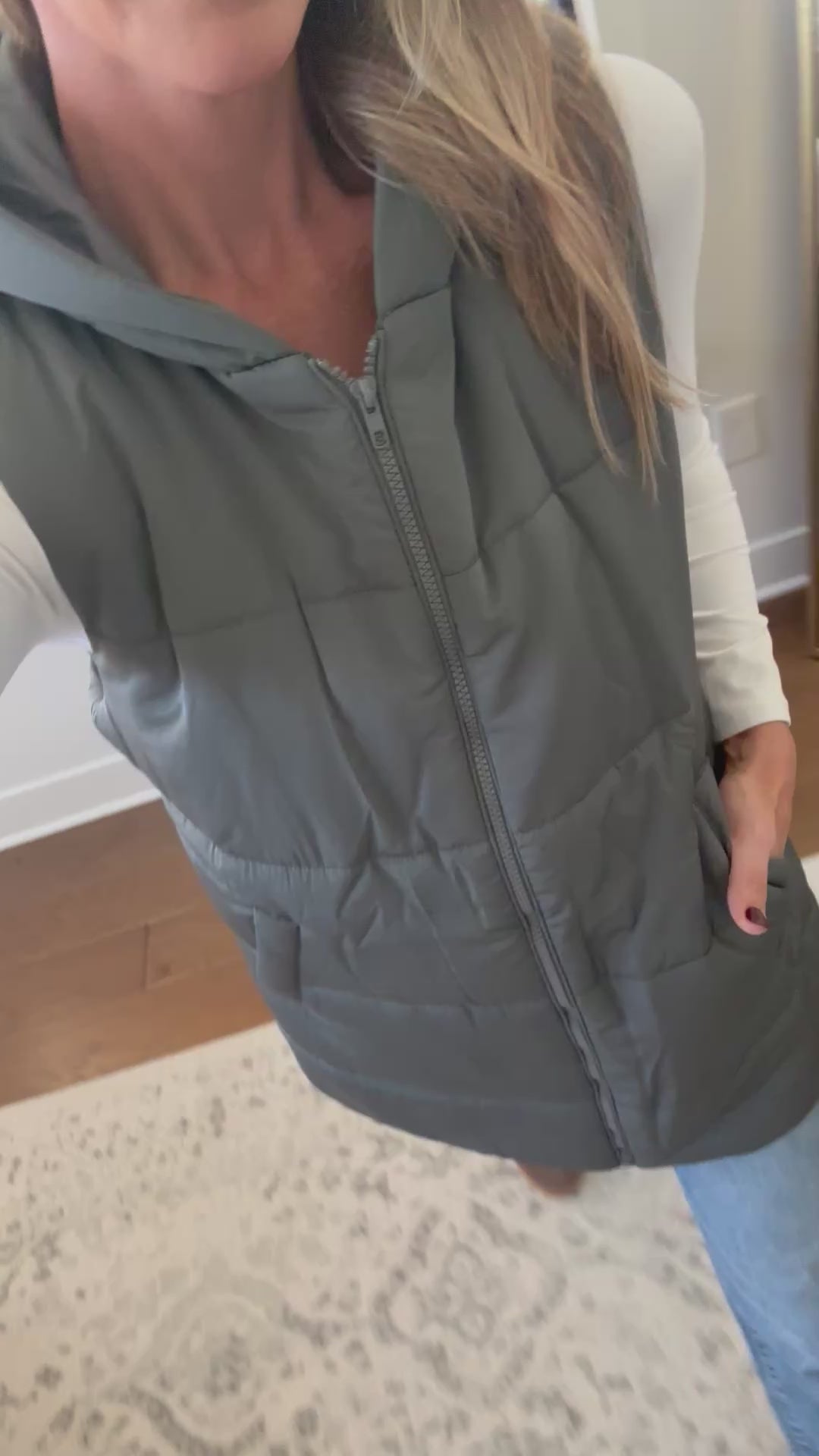 Sleeveless hooded puffer vest with hood and pockets. True to size. Brooke is a size 4, 5'10, and shown in a small.