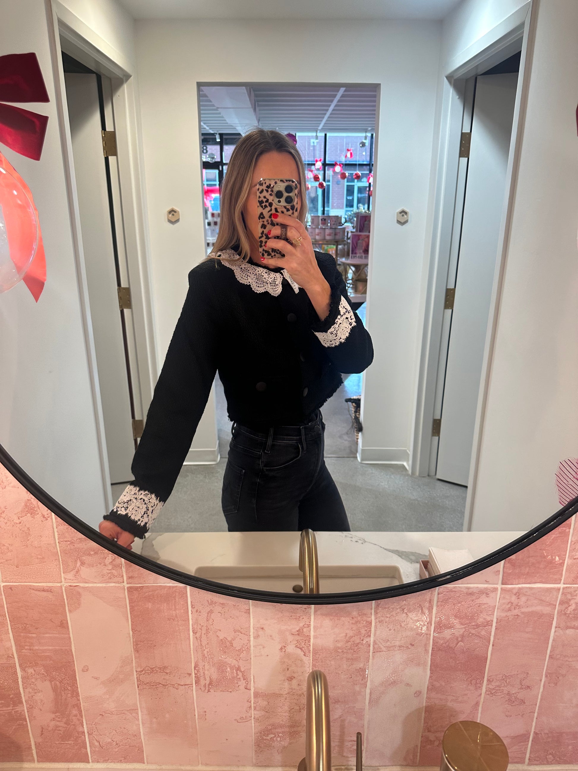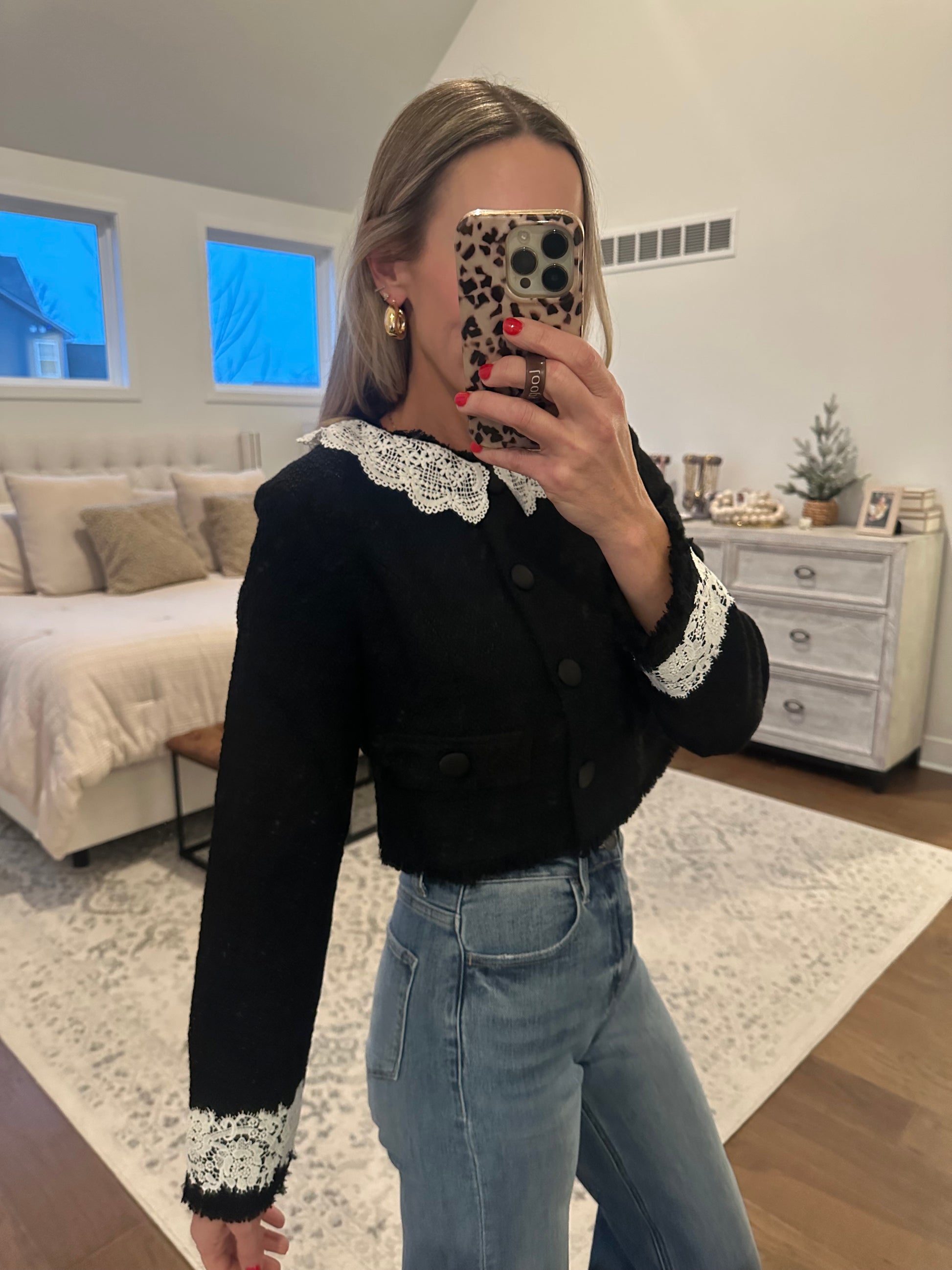 Lace trim tweed jacket with functional buttons. Cropped fit. True to size.
