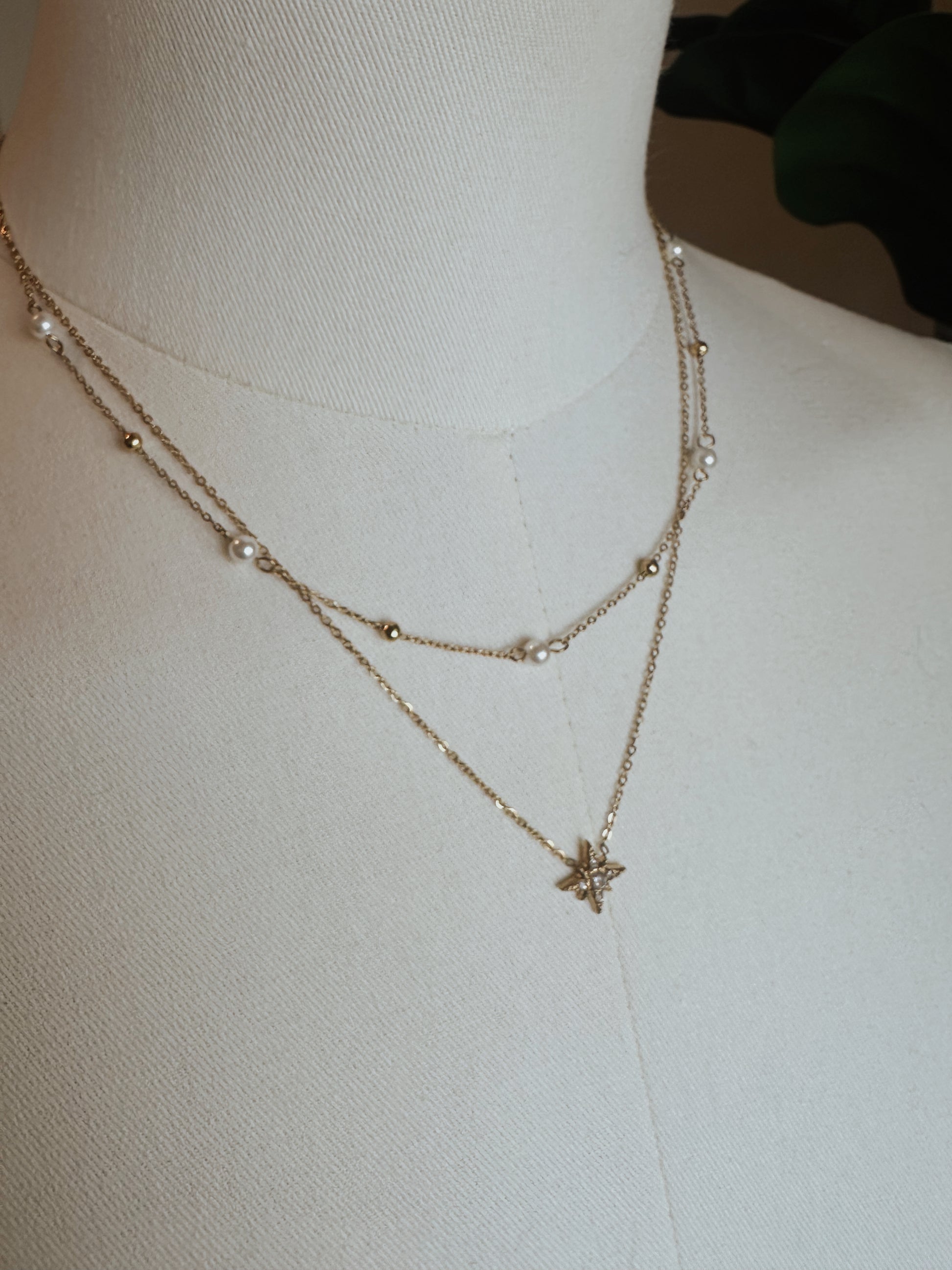Gold plated double strand necklace with pearl detail and rhinestone starburst charm. Tarnish free. Nickel free.