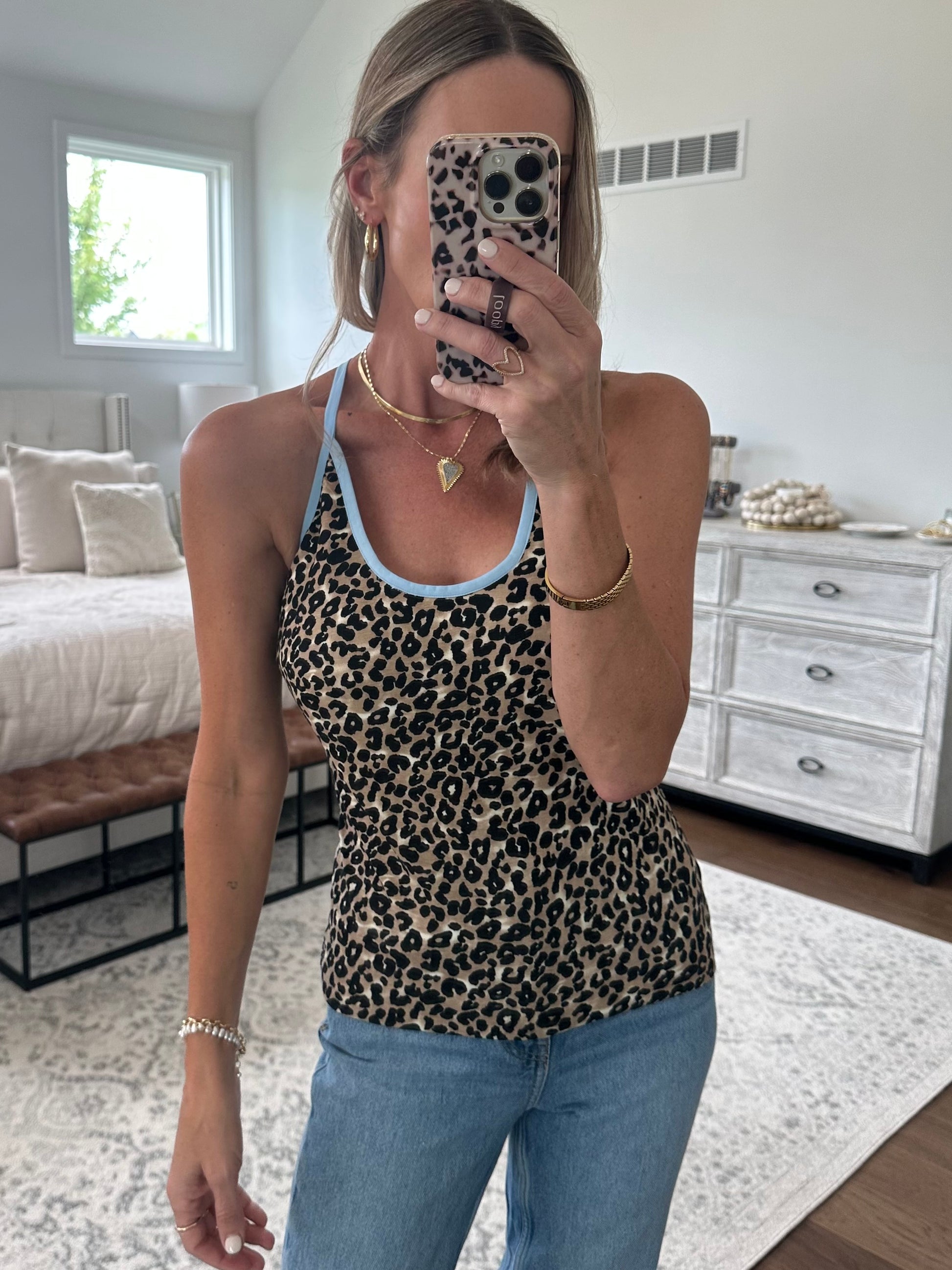 Leopard print tank with light blue accents and padded bust. True to size. Brooke is a size 4 and shown in a small .