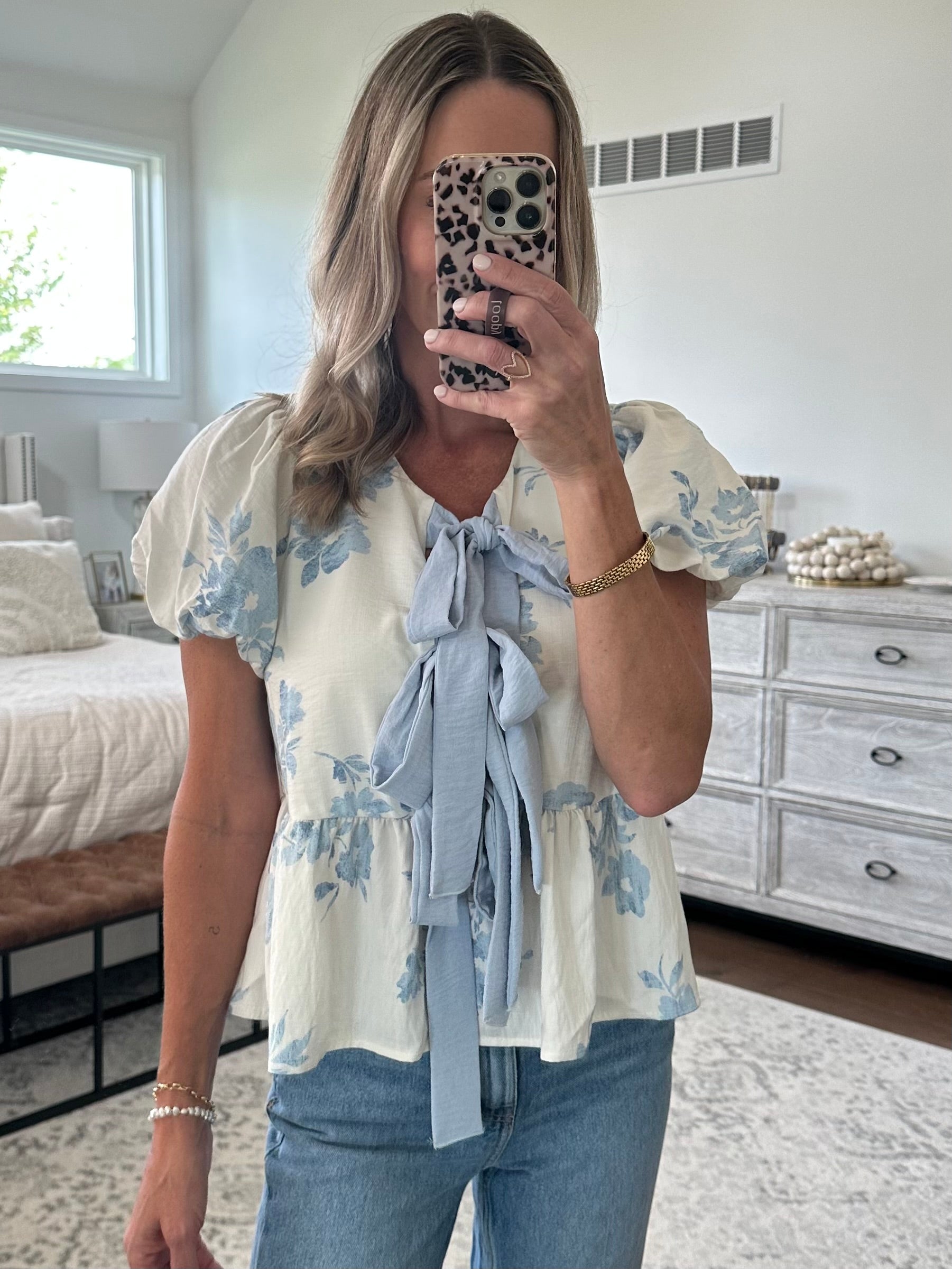 Baby blue and white print with functional bow ties. Stretchy puff sleeve and ruffle hem. True to size fit. Brooke is a size 4 and shown wearing a small.