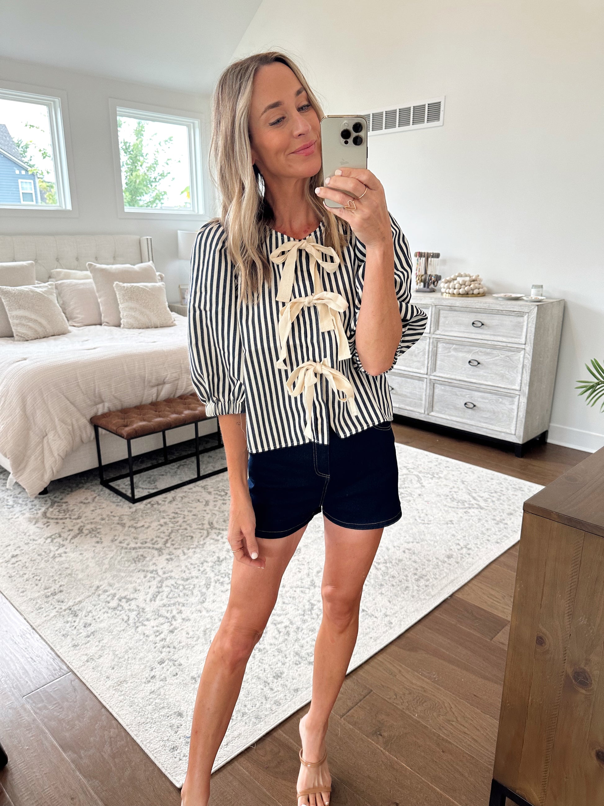 Navy and ivory striped top with functional bow tie detail. Relaxed, true to size fit. Brooke is 5'10, a size 4, and shown wearing a small.