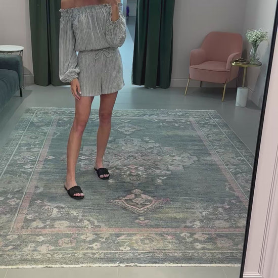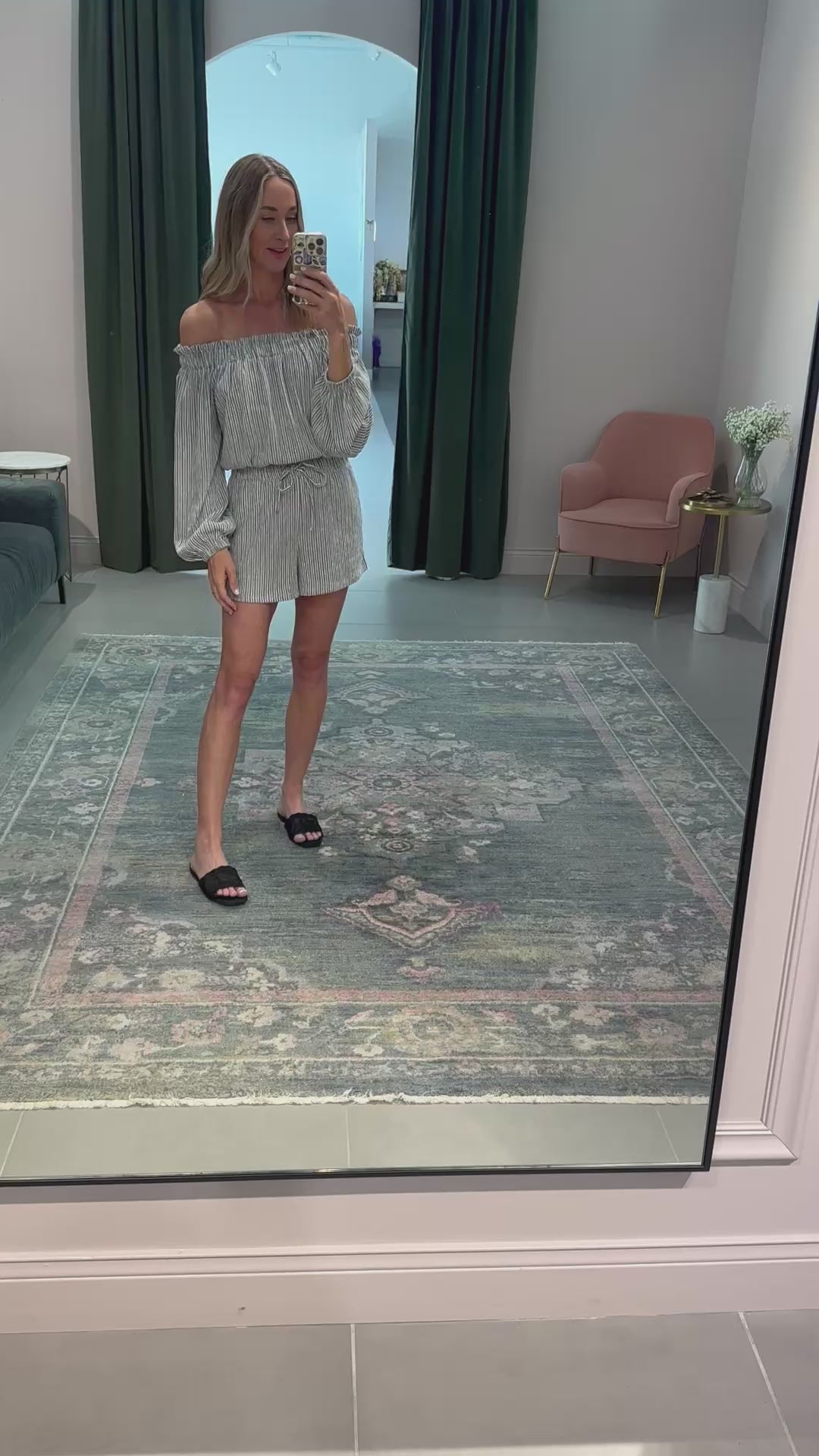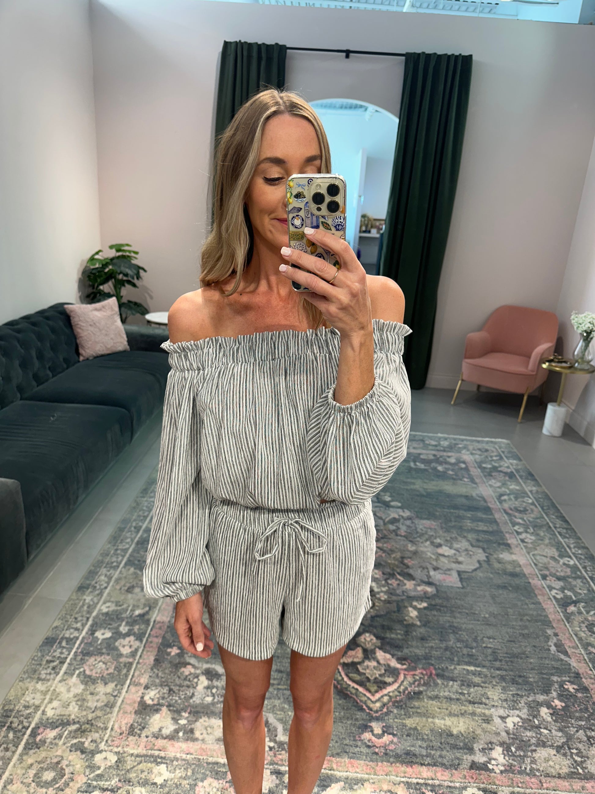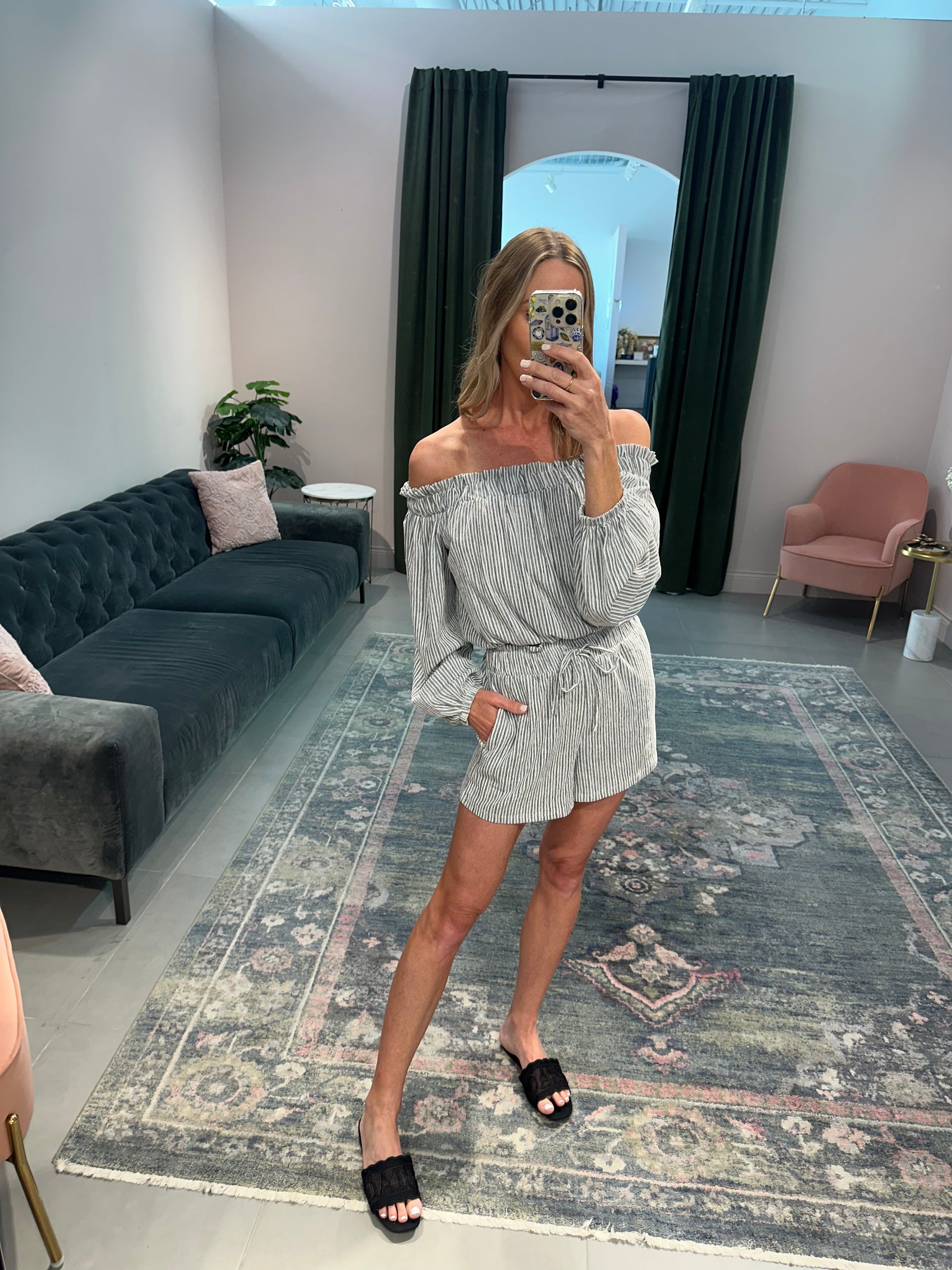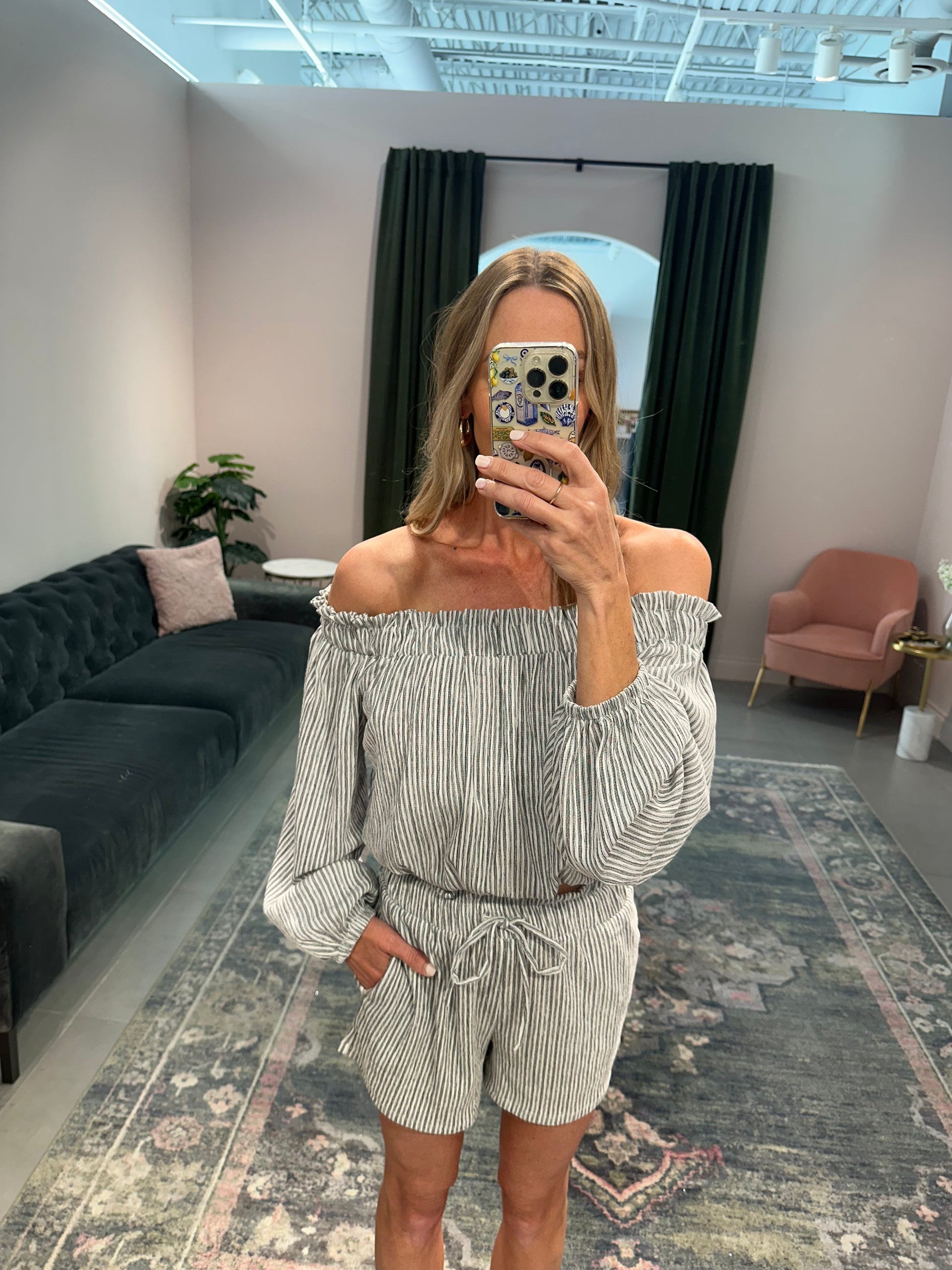 Light weight, 2 piece set in black and white pinstripes. The top is stretchy at the neck and can be worn on or off the shoulders. The shorts have a stretchy waist and pull on easily.
