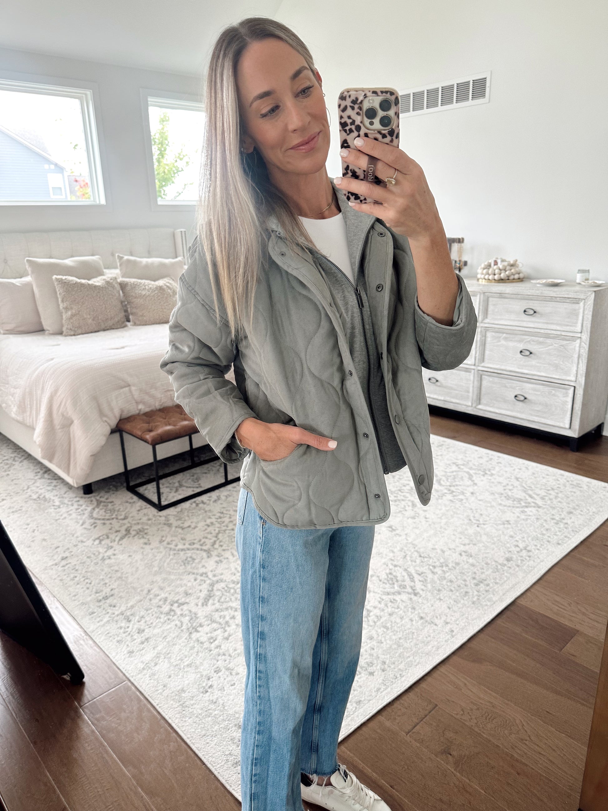 Quilted button up coat with contrasting hood. The fit is relaxed and true to size. Brooke is 5'10, a size 4, and in a small. Removable hood.