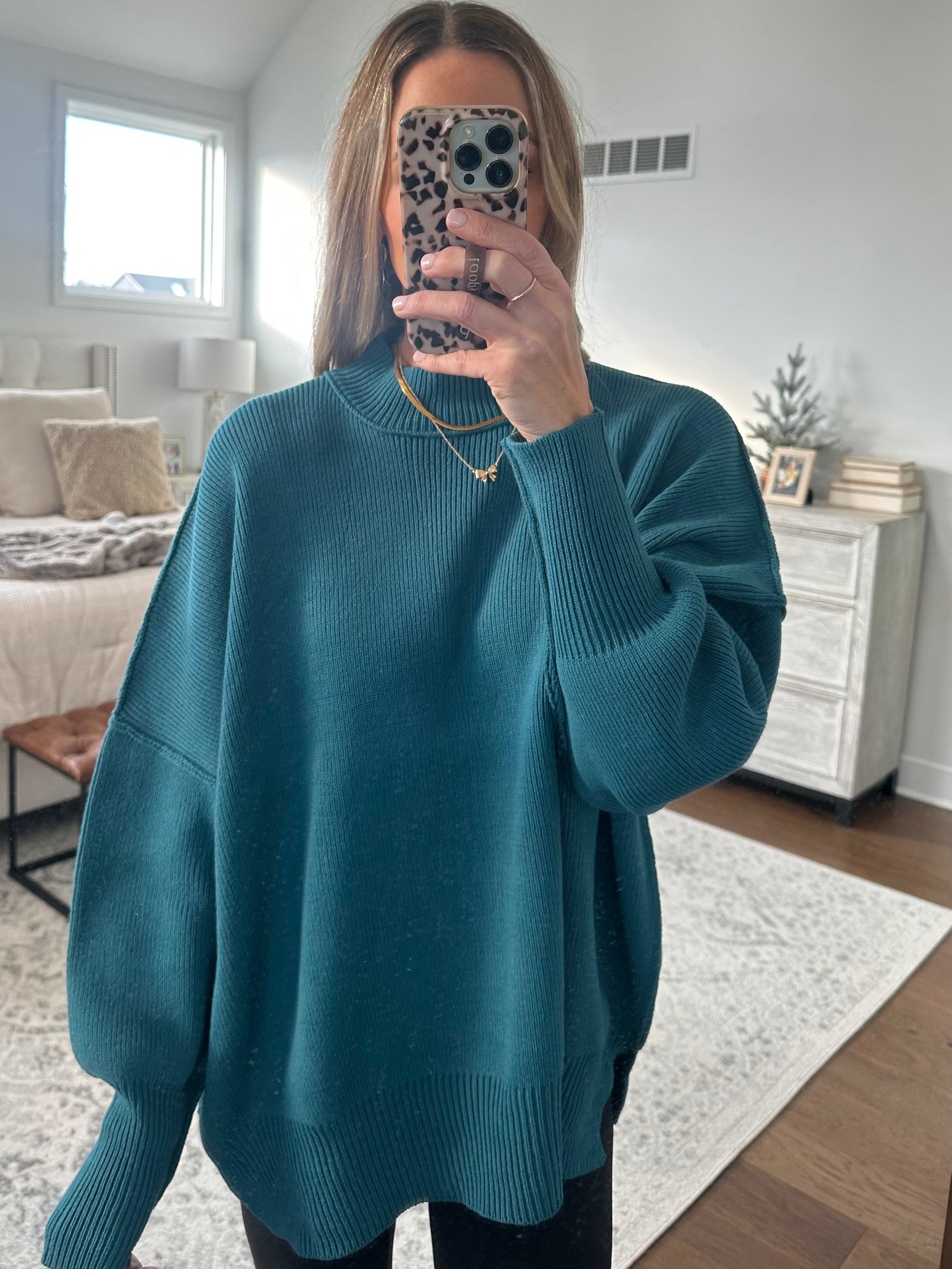 Oversized sweater with crew neck and side sit for the most flattering fit. True to size, zero itch. Brooke is a size 4, 5'10, and shown in the small/medium.