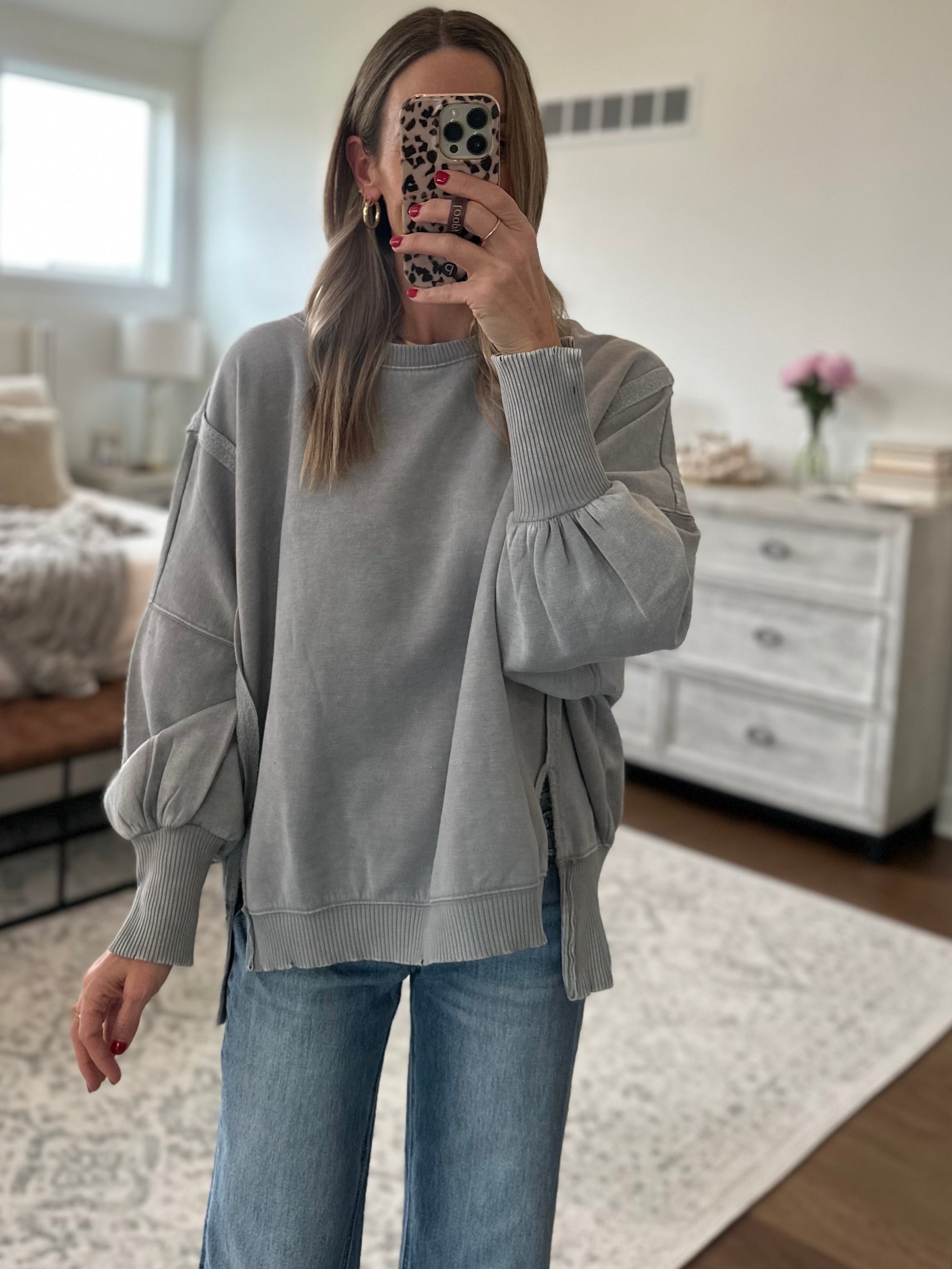 Comfy oversized sweatshirt with batwing sleeves and fleece lined interior. Brooke is a size 4, 5'10, and shown in a s/m.