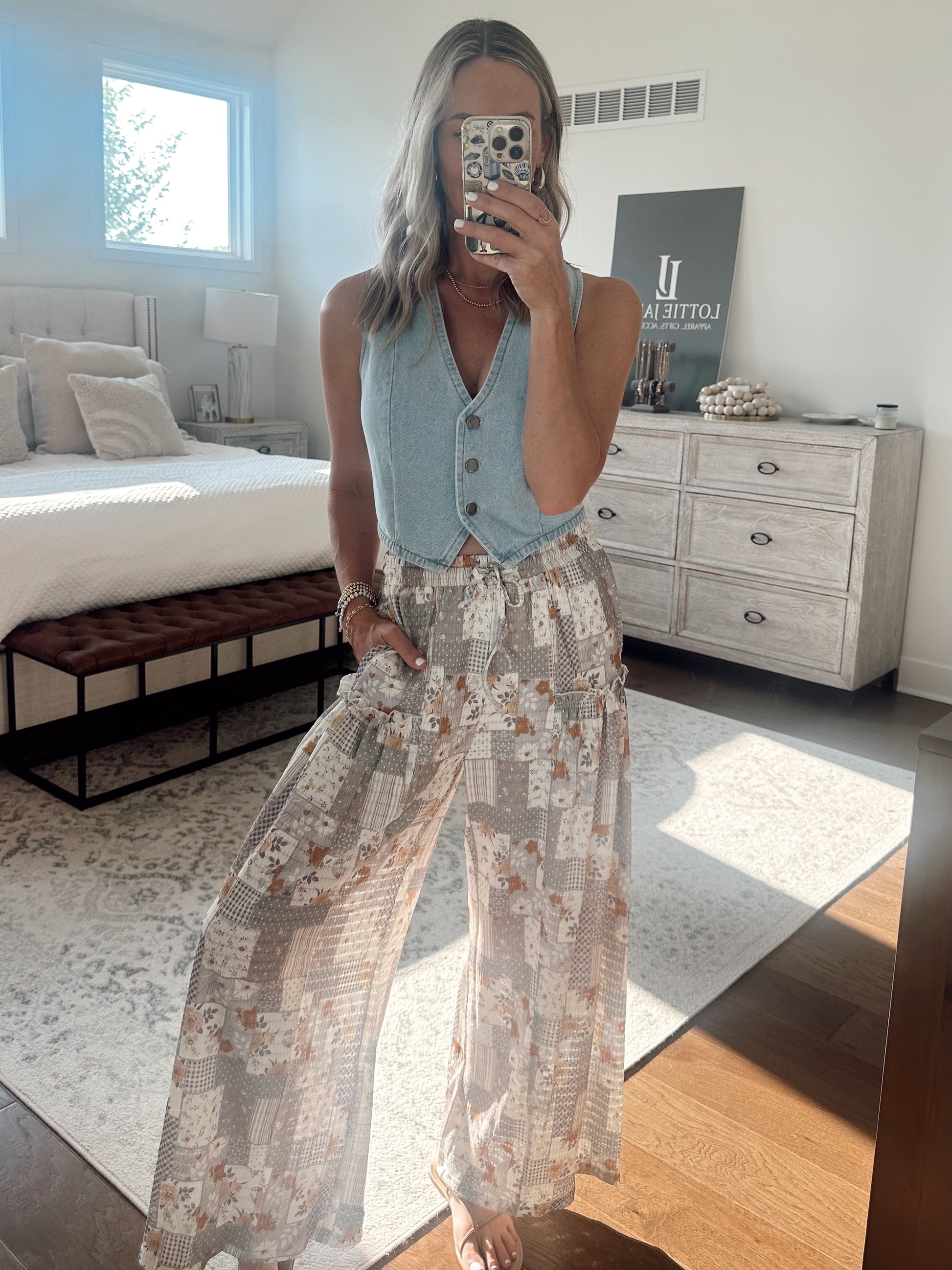 Flowy wide leg pant with drawstring waist and pockets. True to size fit.