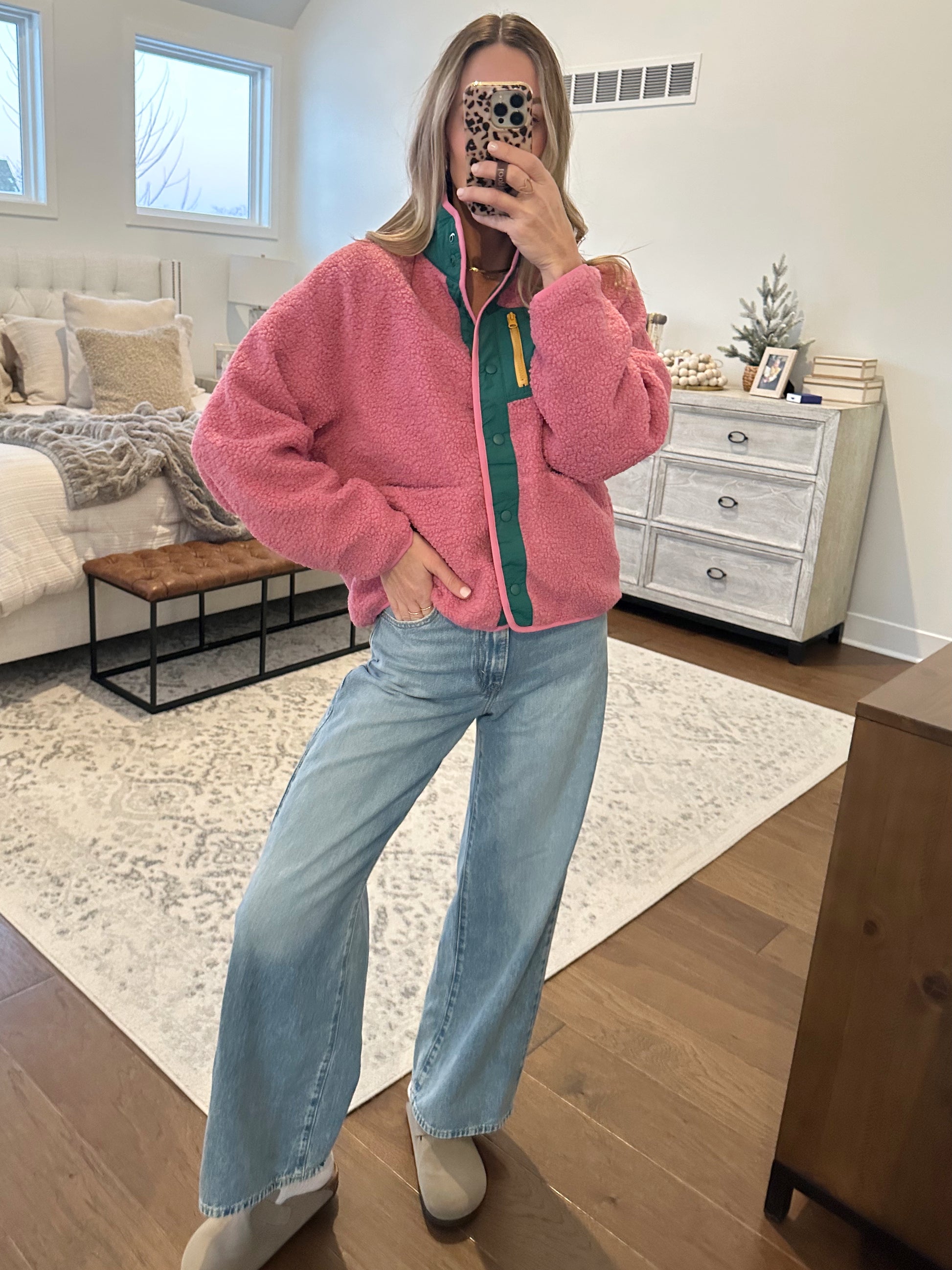 Pink fleece jacket with green accents. Snap button closure, lined, pockets. True to size, relaxed fit. Brooke is a size 4, 5'10, and shown in a small.