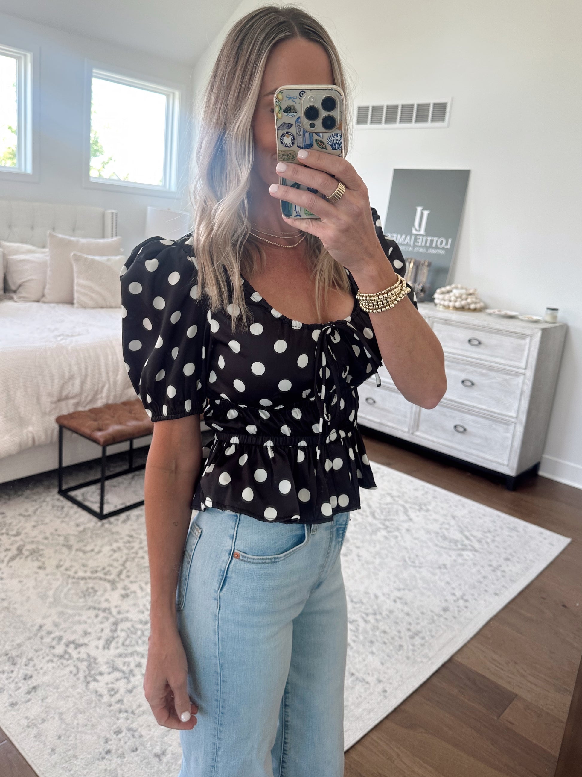 Satin polka dot top with stretchy smocked peplum waist and adjustable tie at the bust. The fit is true to size and Brooke is shown wearing a small.