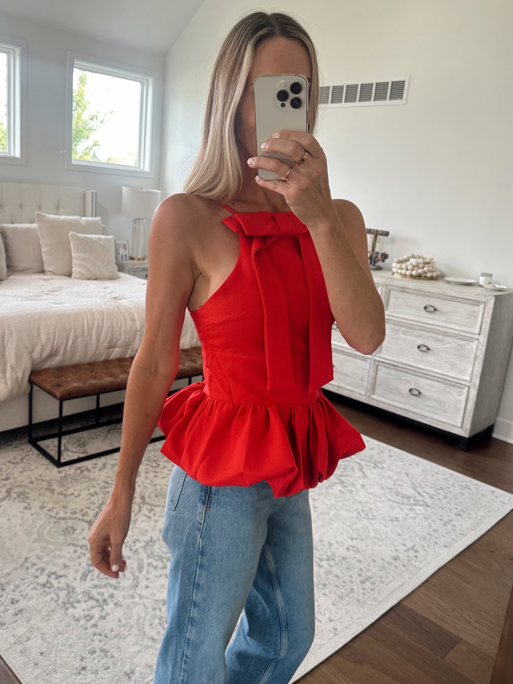 Red bow tank with ruffle bubble hem. True to size fit. Brooke is 5'10, a size 4, and shown in a small.
