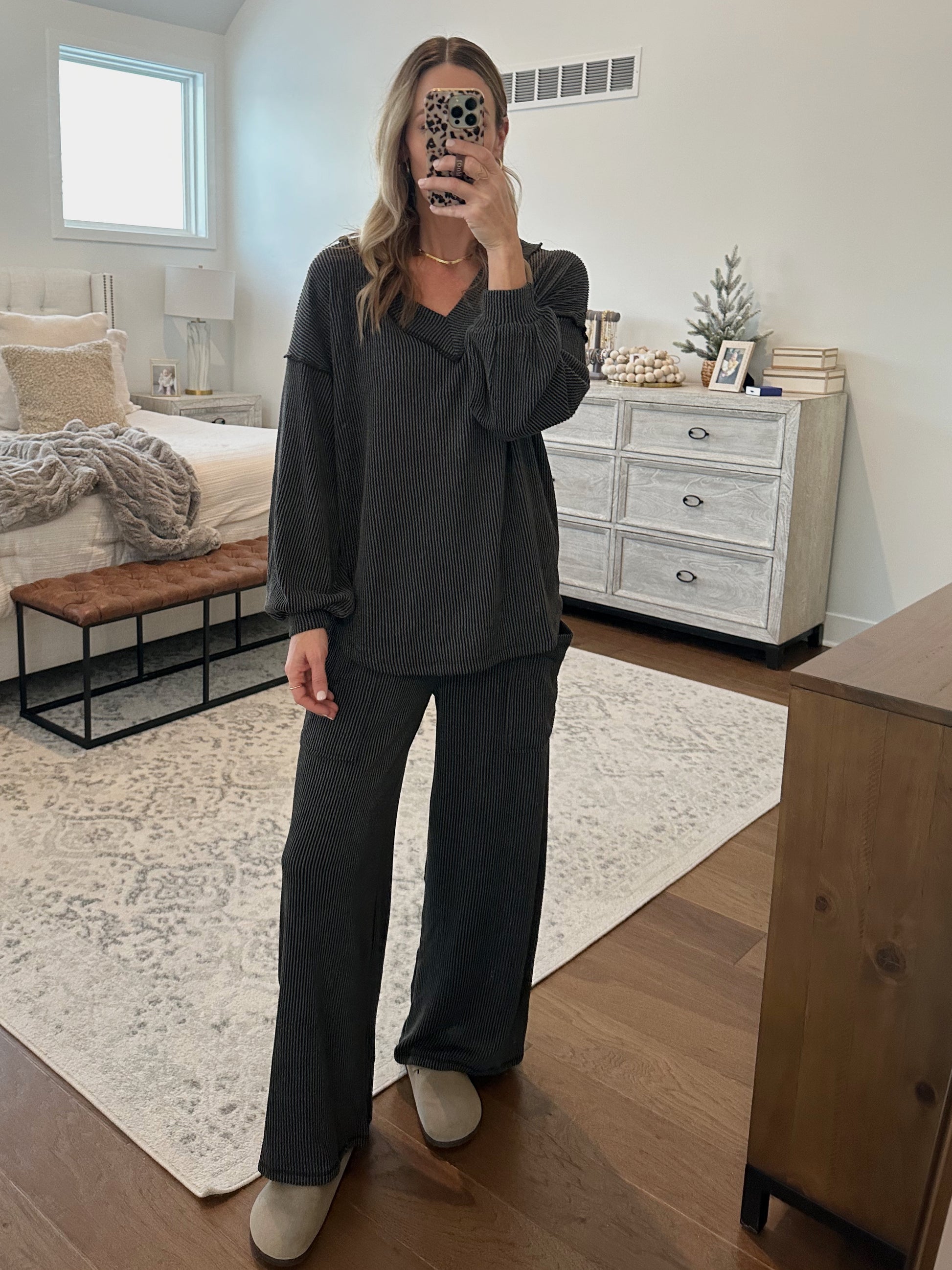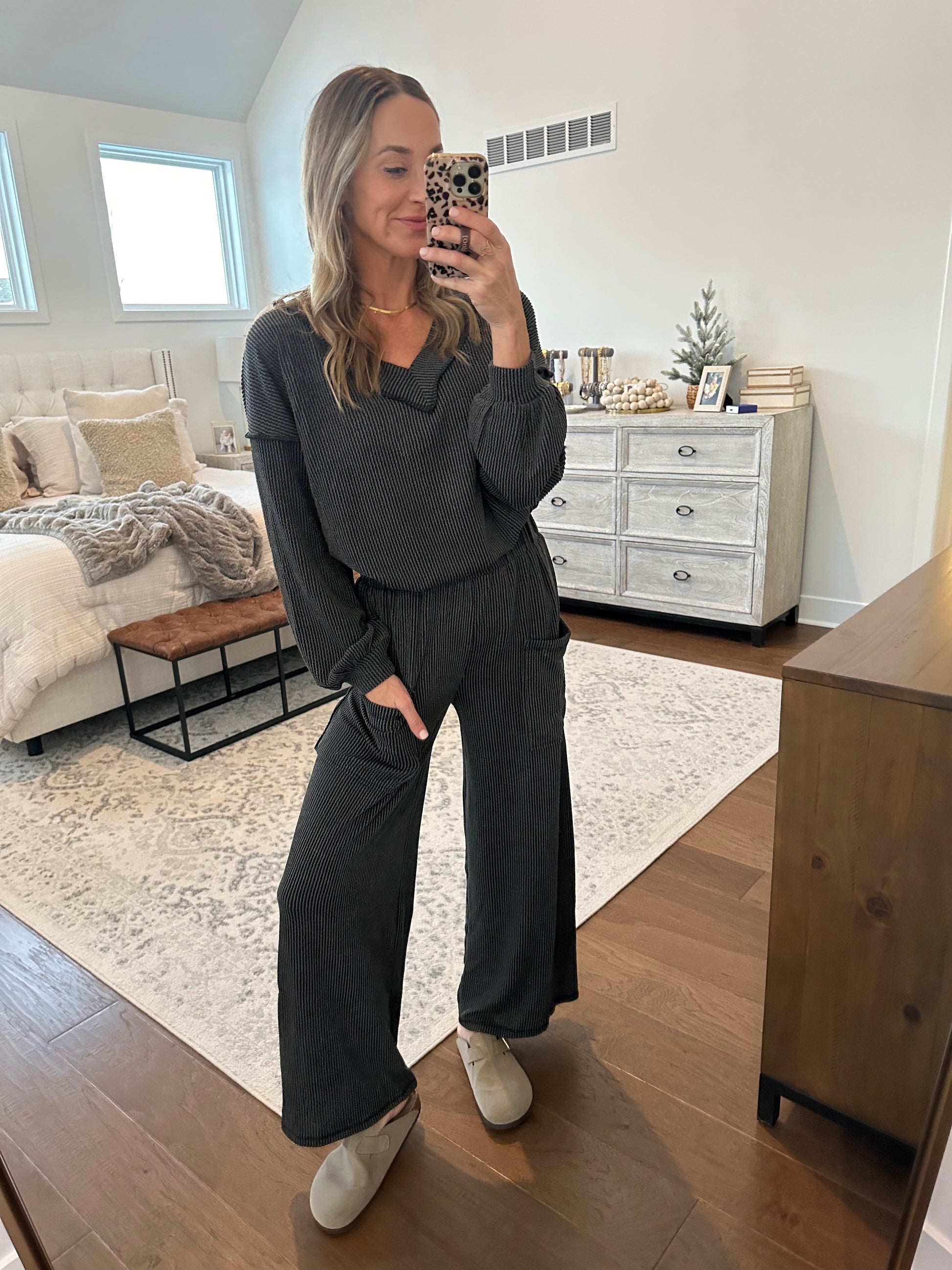 Comfy ribbed set. Comes with the top and lounge pant. The waist on the pants is stretchy + pockets. The top is meant to fit oversized. Brooke is a size 4, 5'10, and shown in a small.