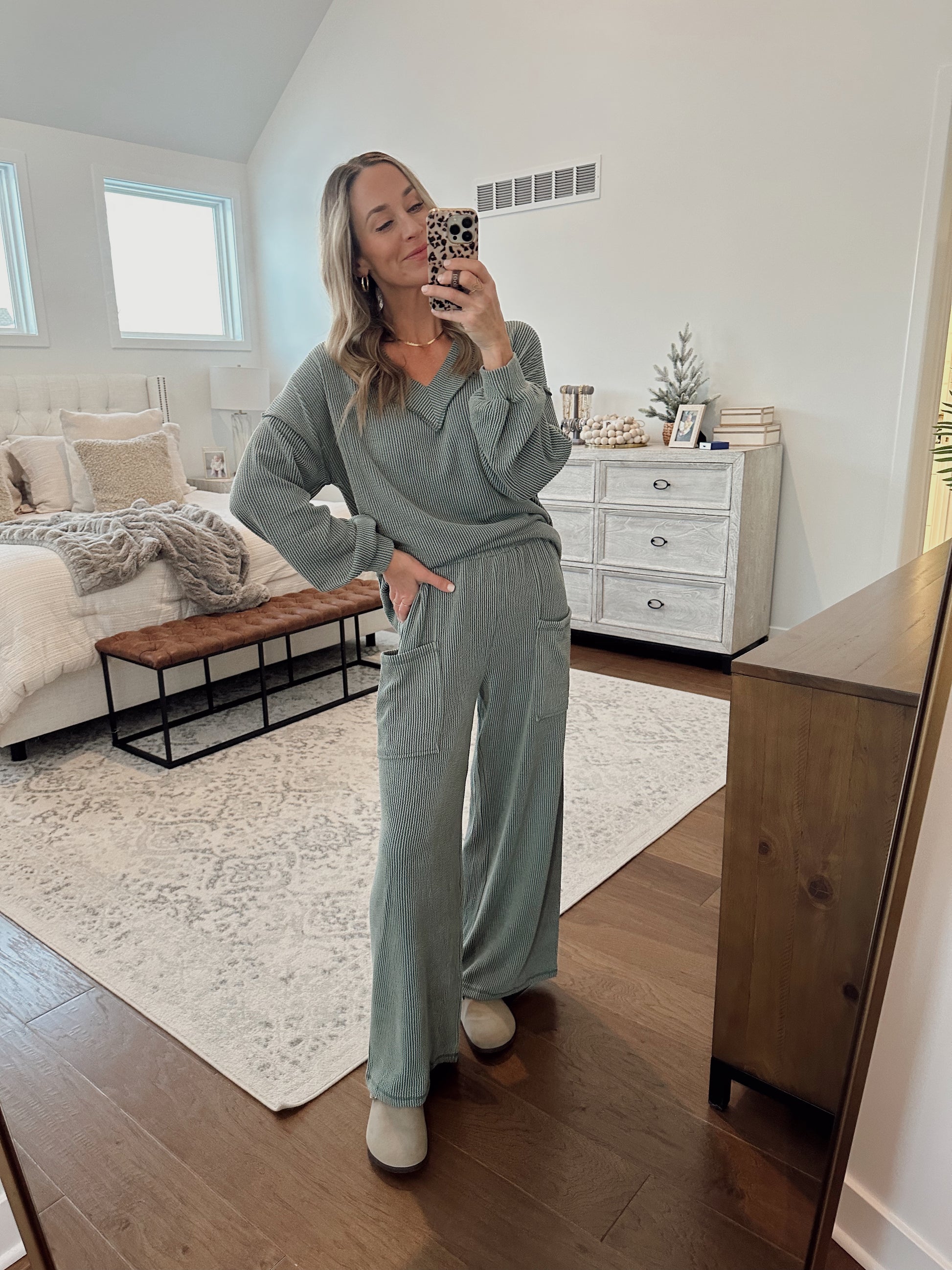 Comfy ribbed set. Comes with the top and lounge pant. The waist on the pants is stretchy + pockets. The top is meant to fit oversized. Brooke is a size 4, 5'10, and shown in a small.