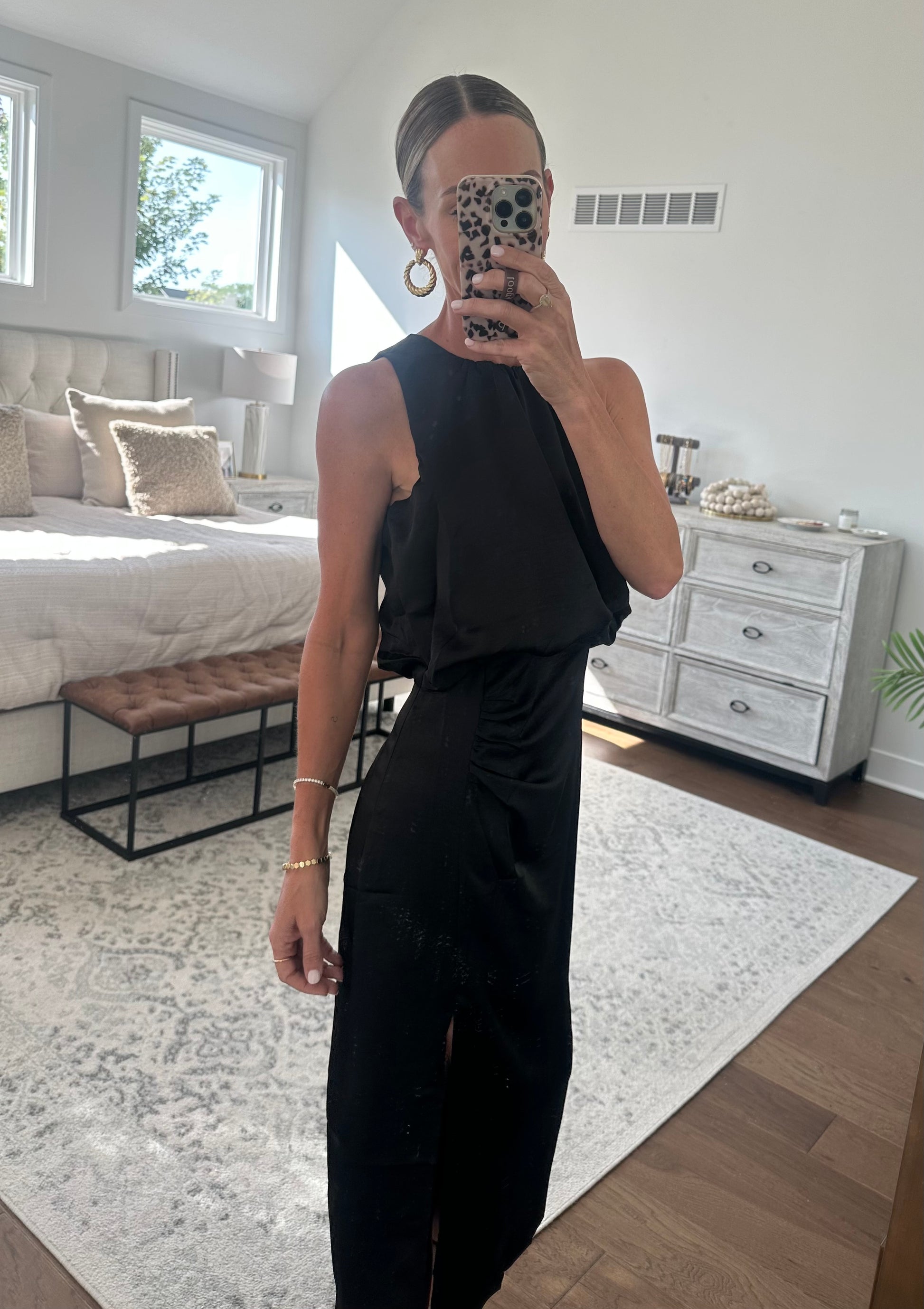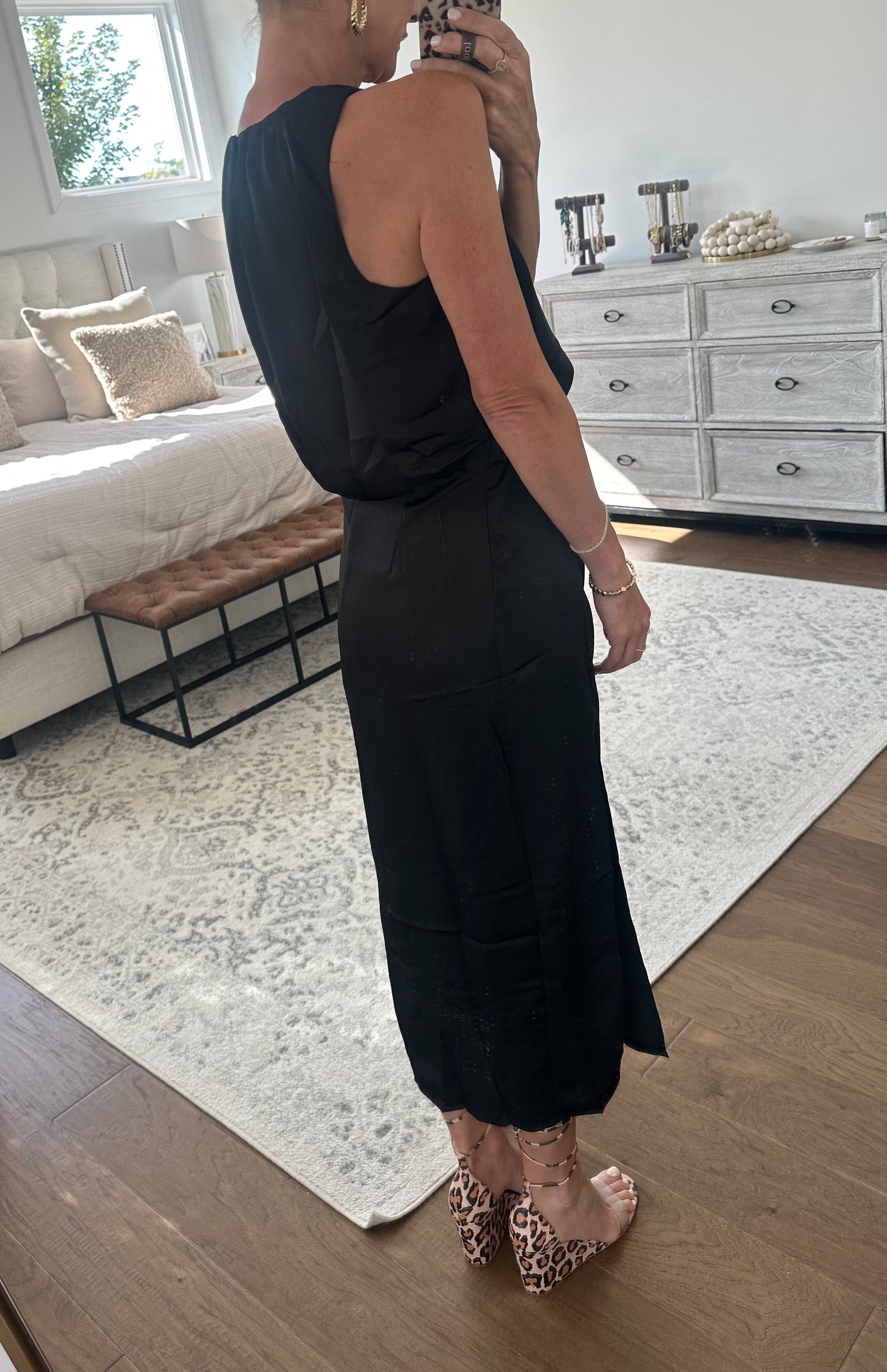 Round neck satin midi dress with side zip closure and single button back. Bloused bust. True to size fit. Brooke is a size 4, 5'10, and shown in a small.