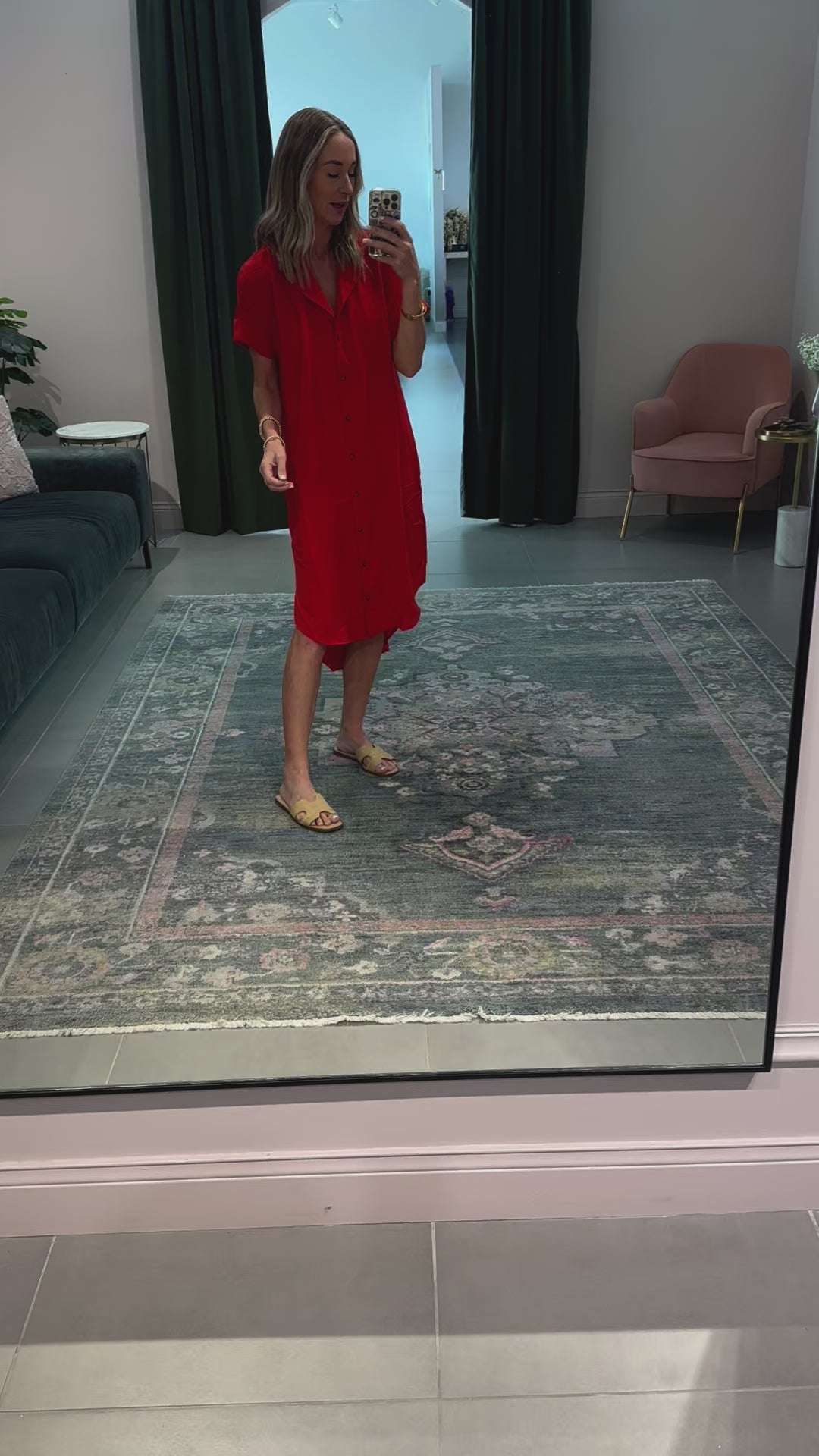 Shirt dress with functional buttons and pockets. Unlined, not sheer. The fit is relaxed and true to size. Made of poly fabric.