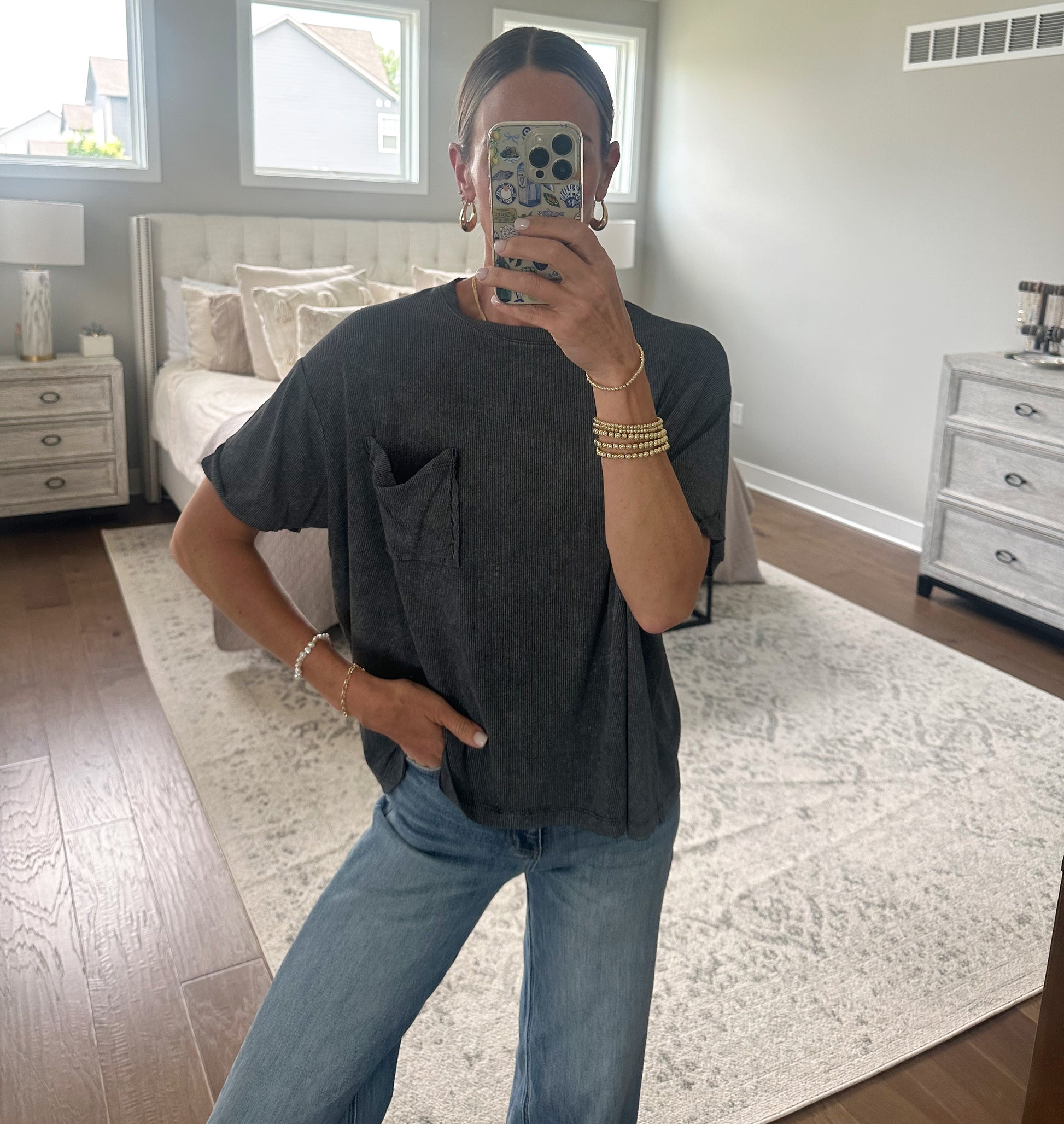 Relaxed fit top with cuffed sleeve and true to size fit.