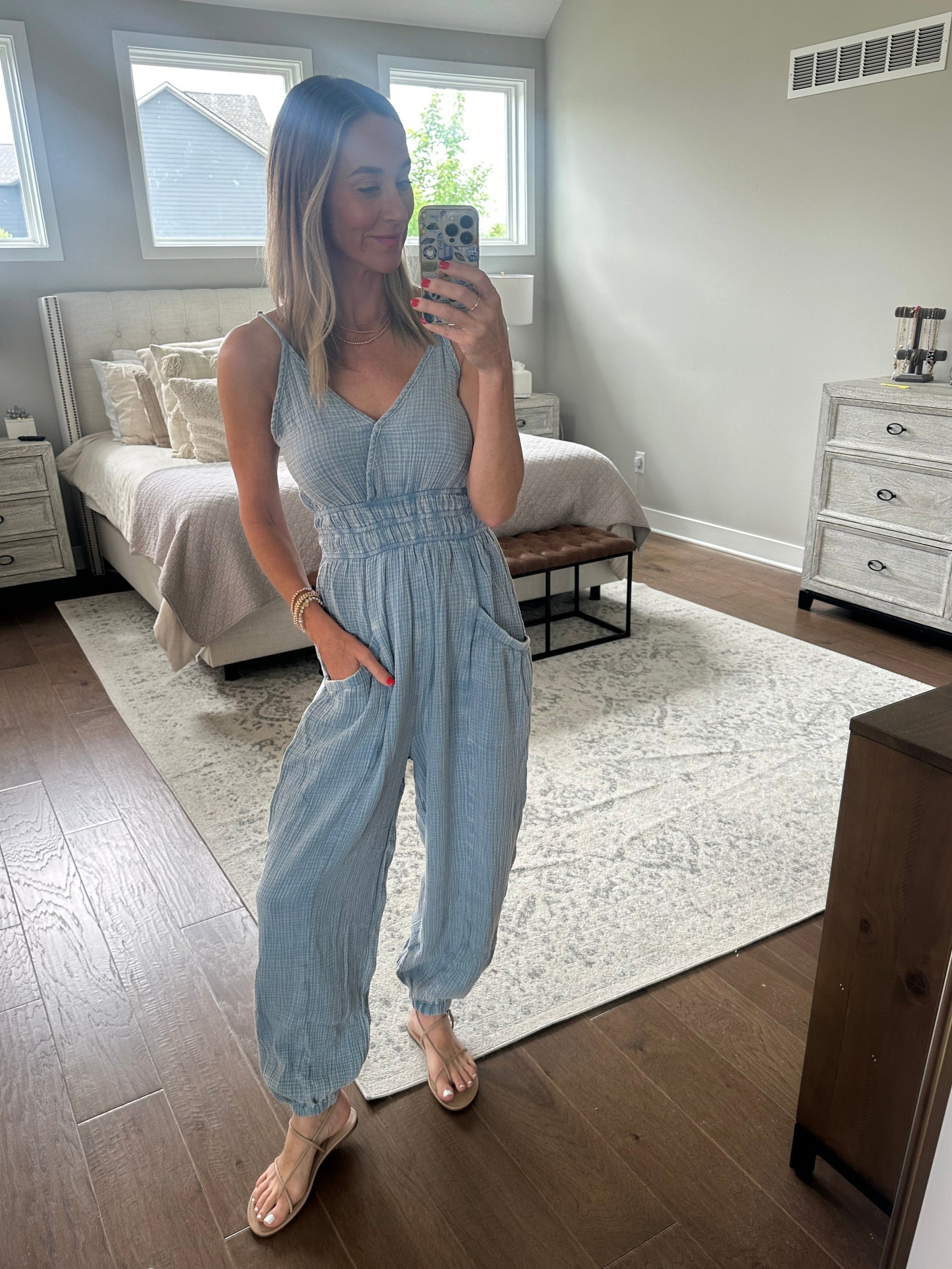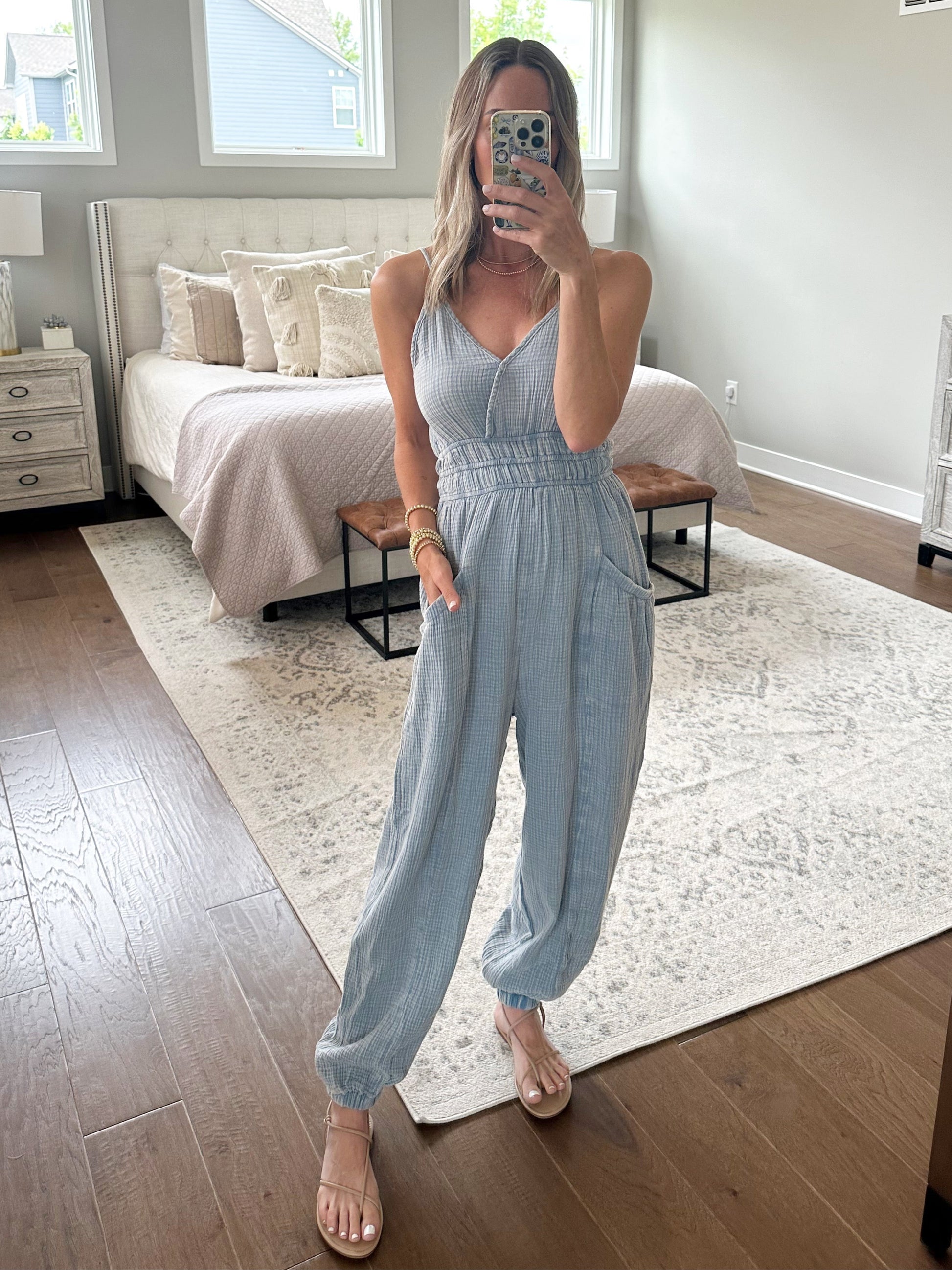 Soft woven jumpsuit with deep pockets and adjustable straps. The fit is loose and roomy. Size down if you are between sizes. Brooke is 5'10, size 4, and wearing a small.