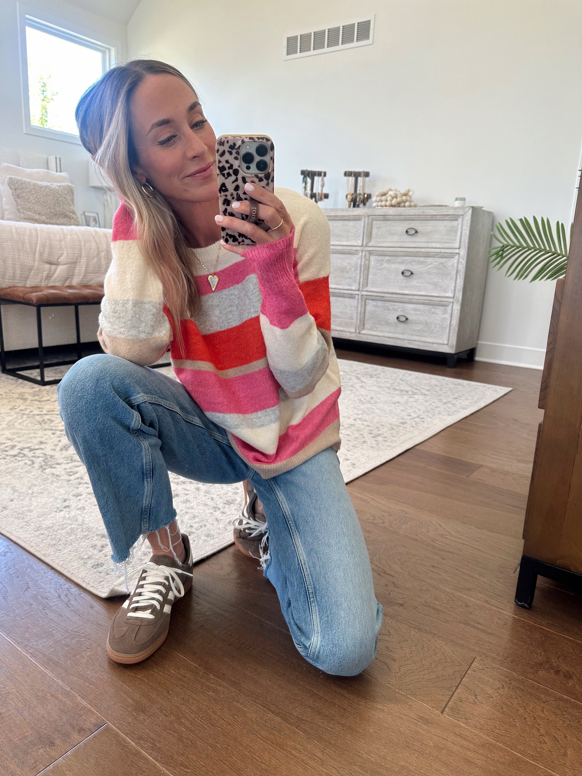 Soft sweater, zero itch, with striped detail. Relaxed, comfy fit. Brooke is shown in a small and a size 4.