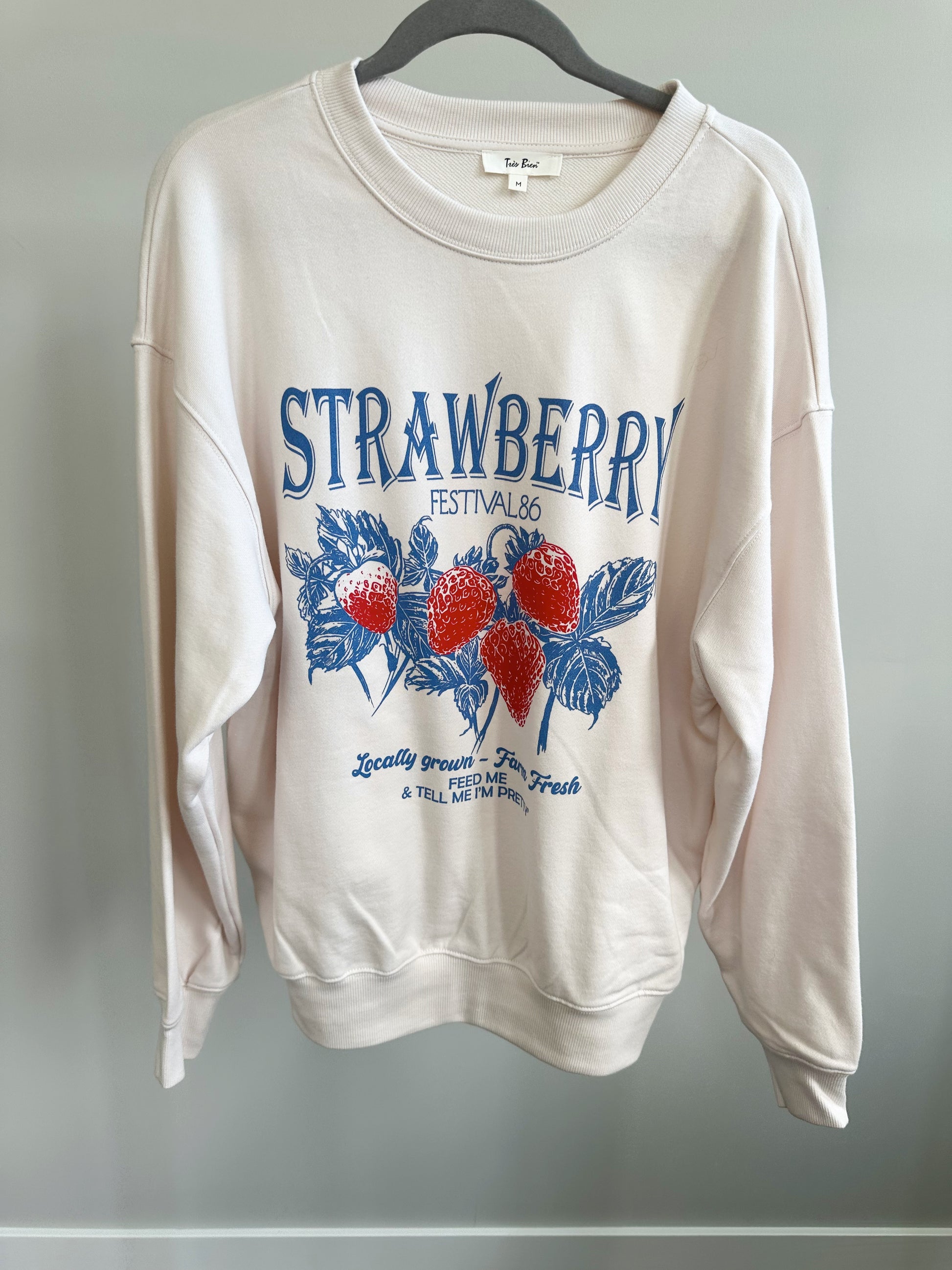Strawberry Festival graphic sweatshirt with soft interior lining and true to size fit. Brooke is shown in a medium and it's made of a cotton blend fabric.
