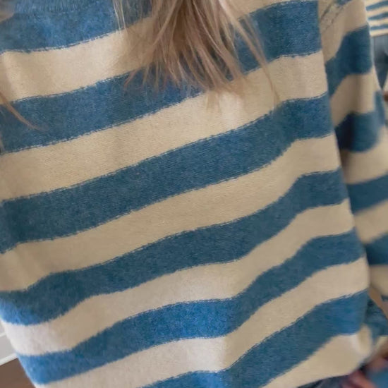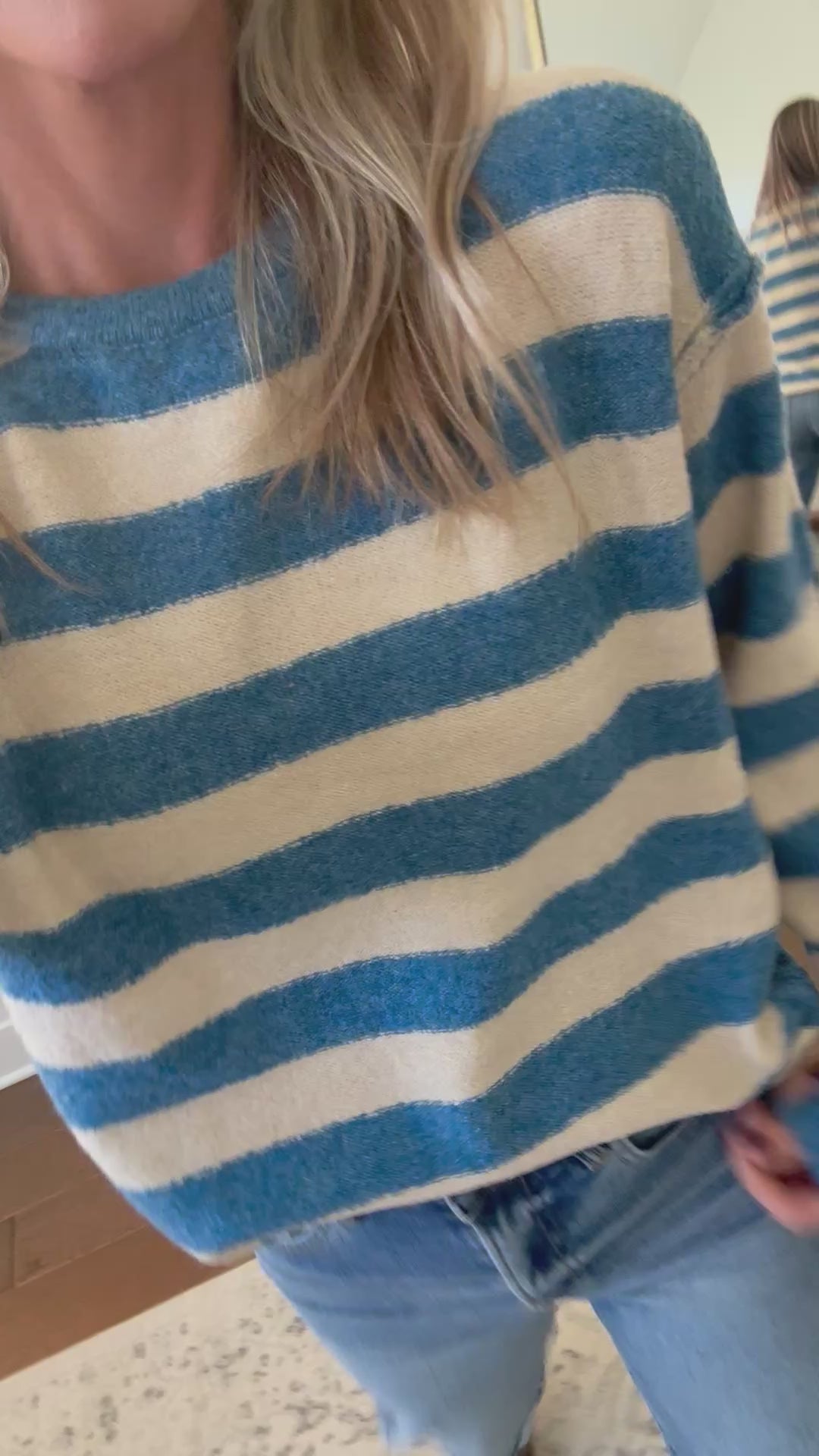 Striped crew neck sweater in blue and oatmeal. True to size, no itch. Brooke is a size 4, 5'10, and shown in a small.