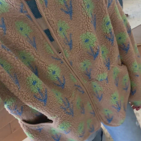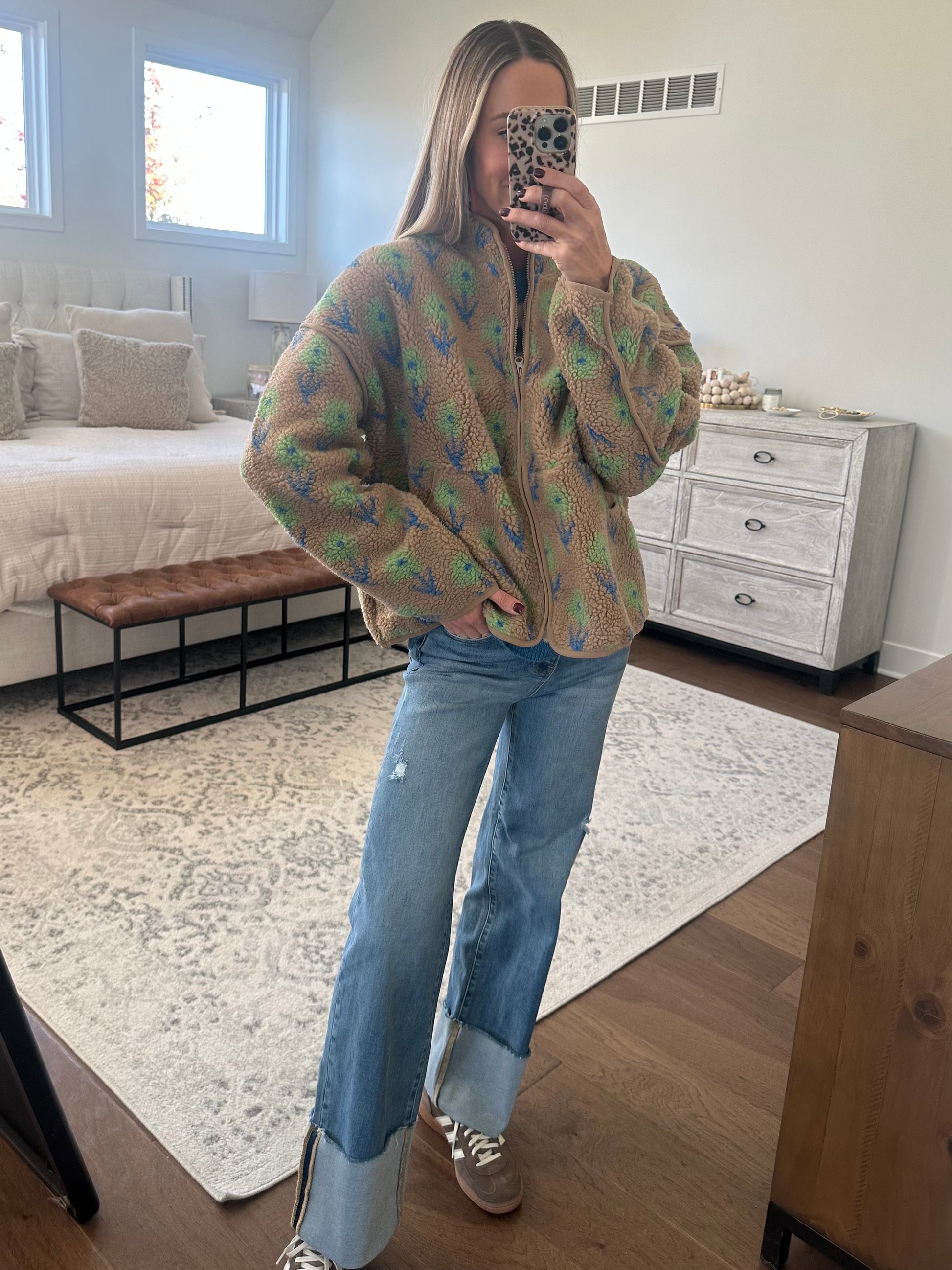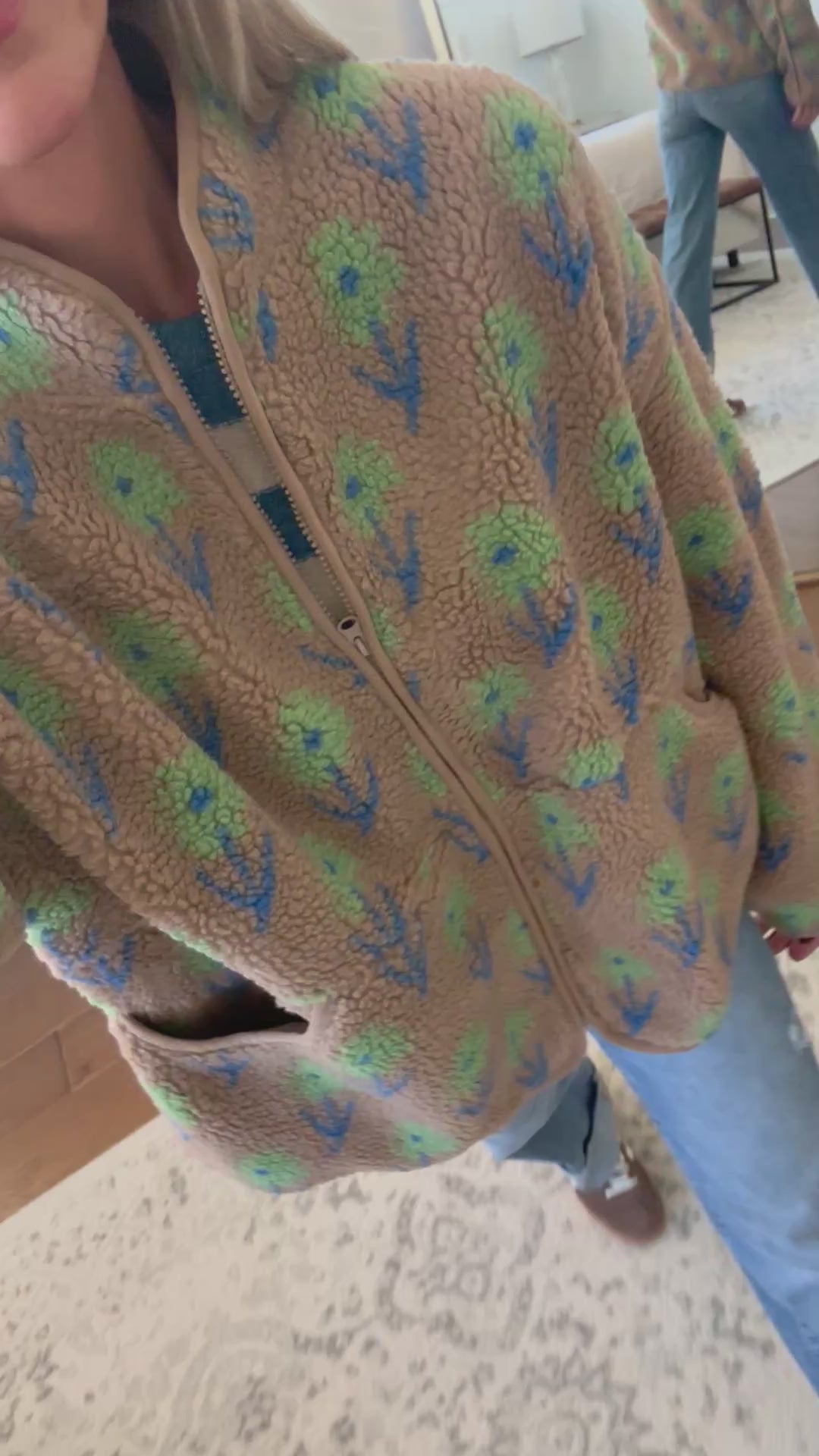 Taupe fleece with flower detail. Full zip closure with pockets. True to size, relaxed fit. Brooke is shown in the small.