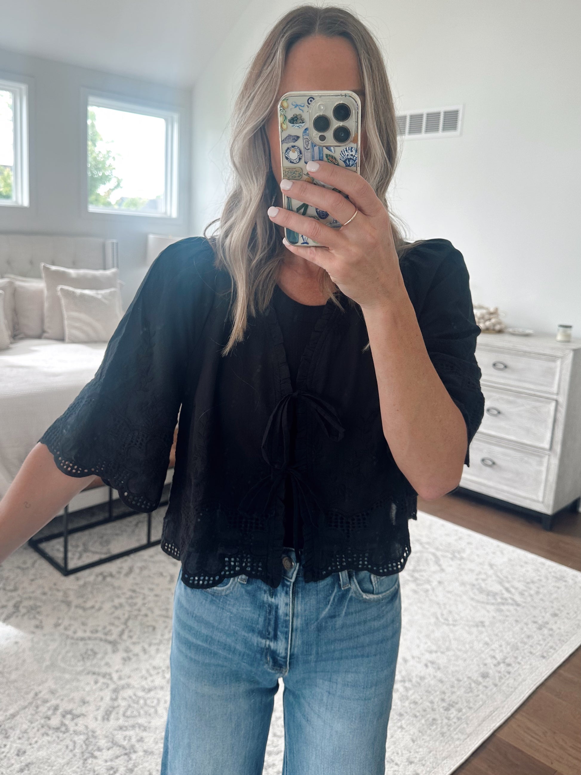Black tie front blouse with floral embroidery. The fit is true to size and Brooke is shown in a size small. Made of cotton, hand wash cold.