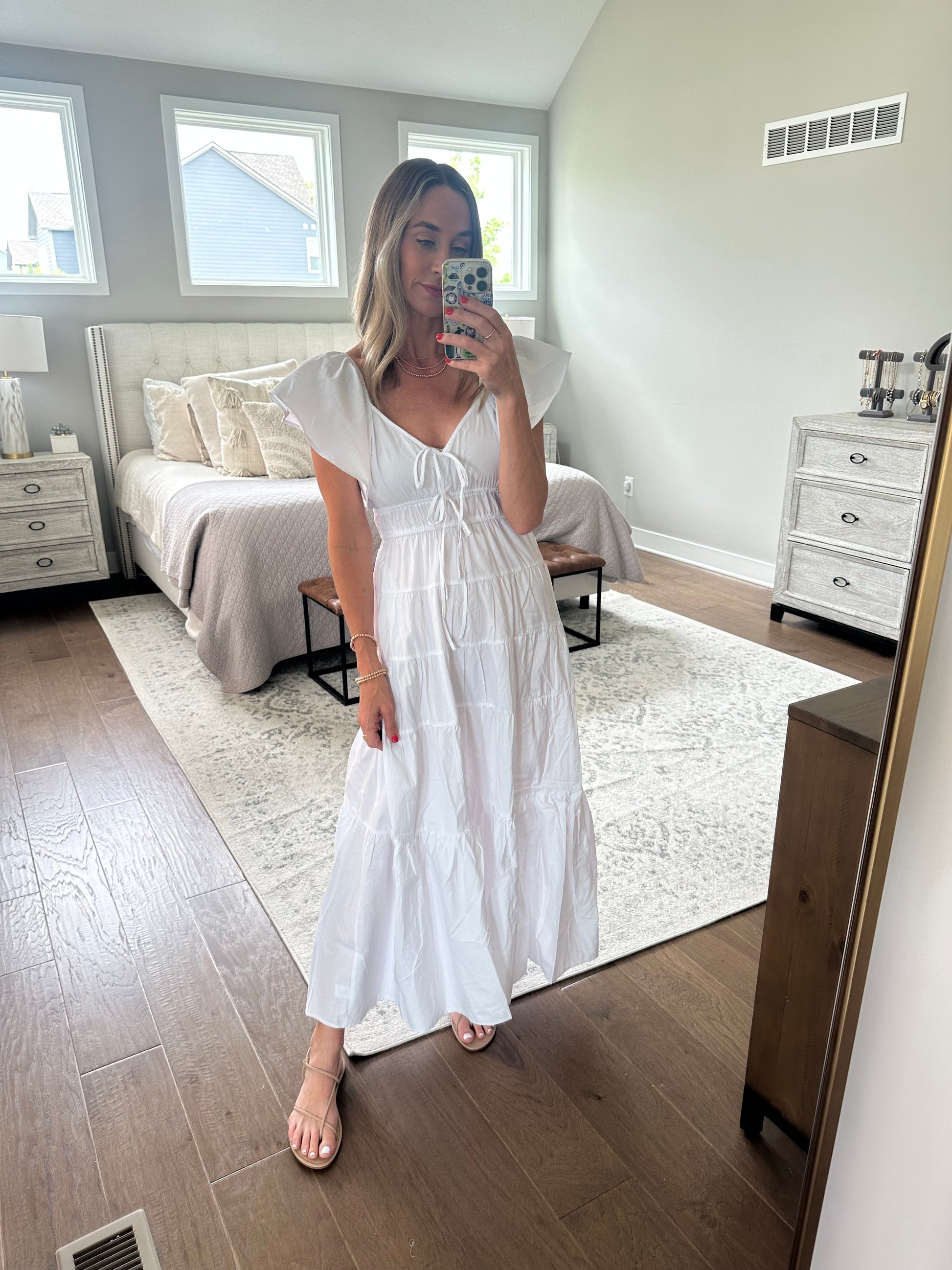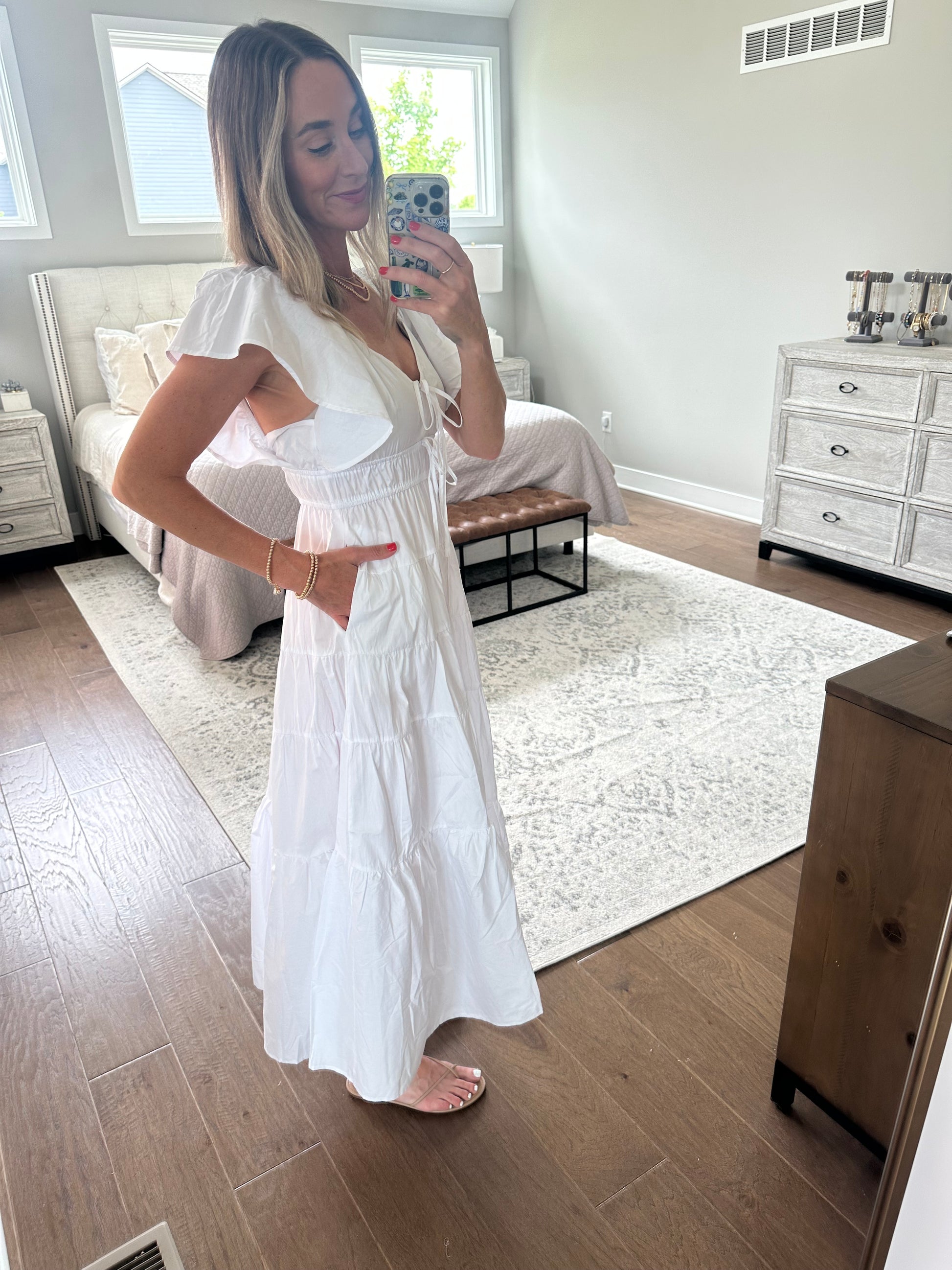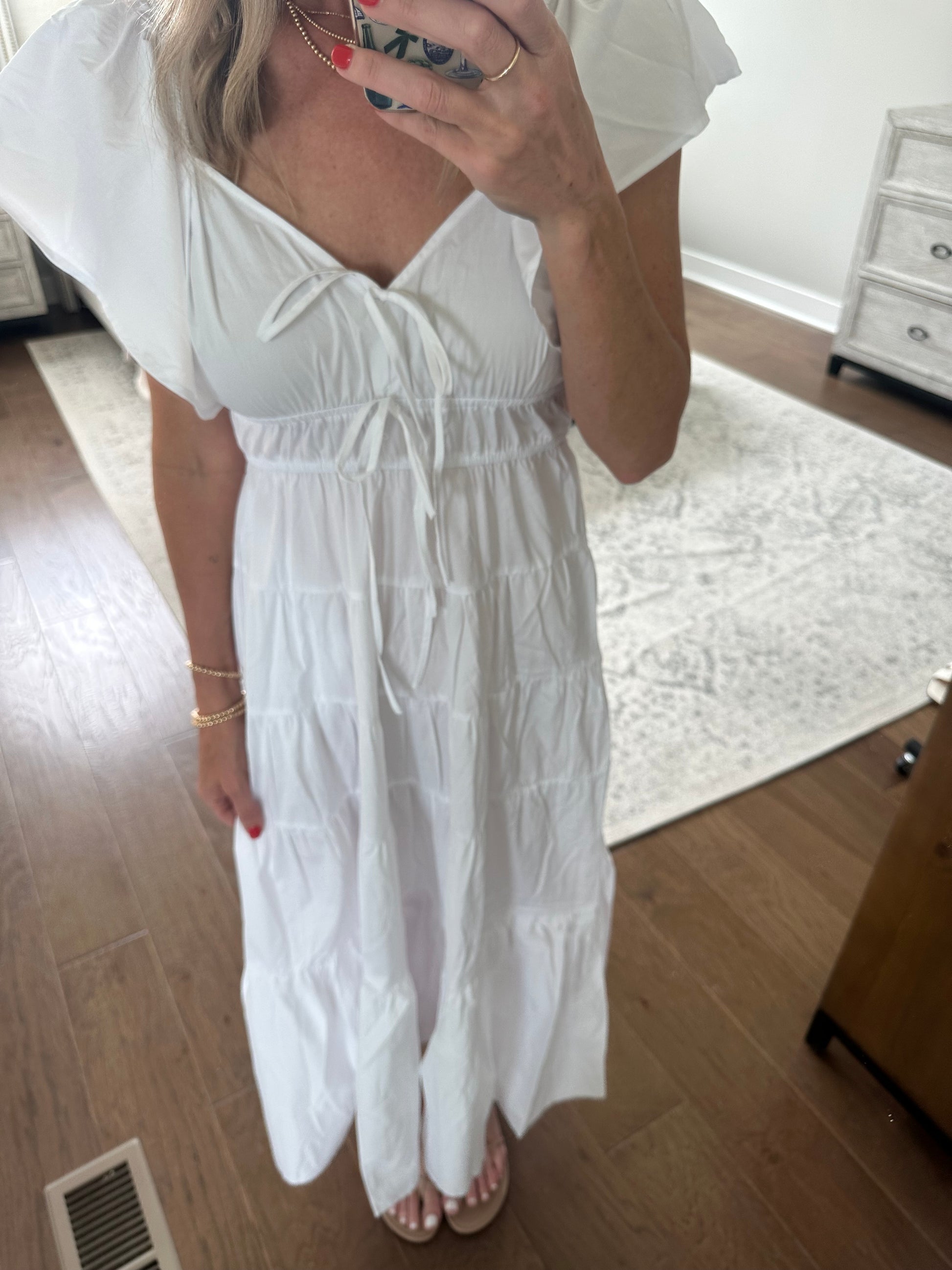 Woven maxi dress with ruffle straps and faux tie front detail. The bust is stretchy and true to size. Brooke is 5'10, size 4, and wearing a small. This is unlined, semi sheer. Made of cotton fabric, hand wash cold.