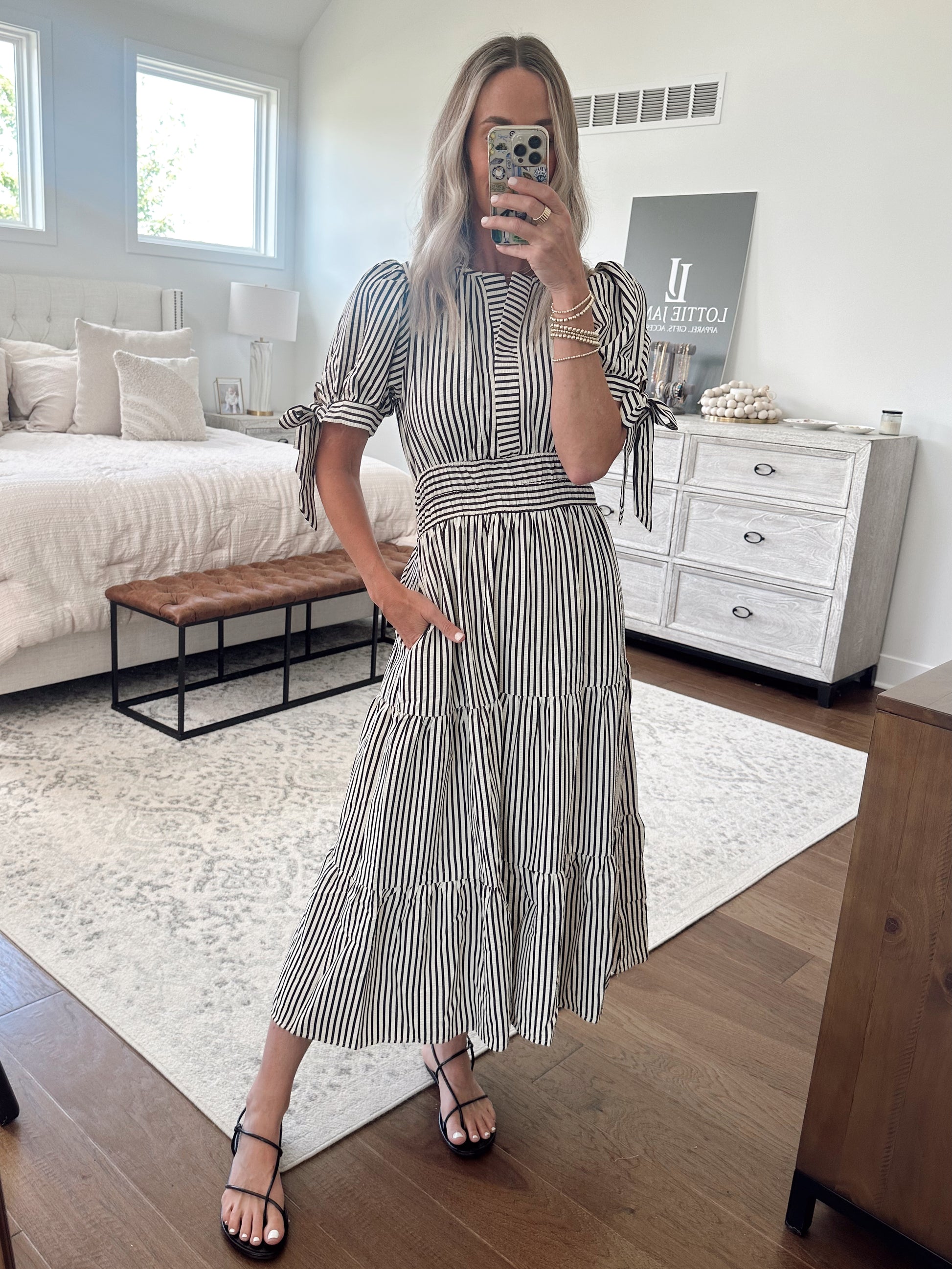 Tie short sleeve midi dress in ivory with black striped. Stretchy smocked waist, pockets, and lined. The fit is true to size. Brooke is 5'10, a size 4, and shown wearing a small.