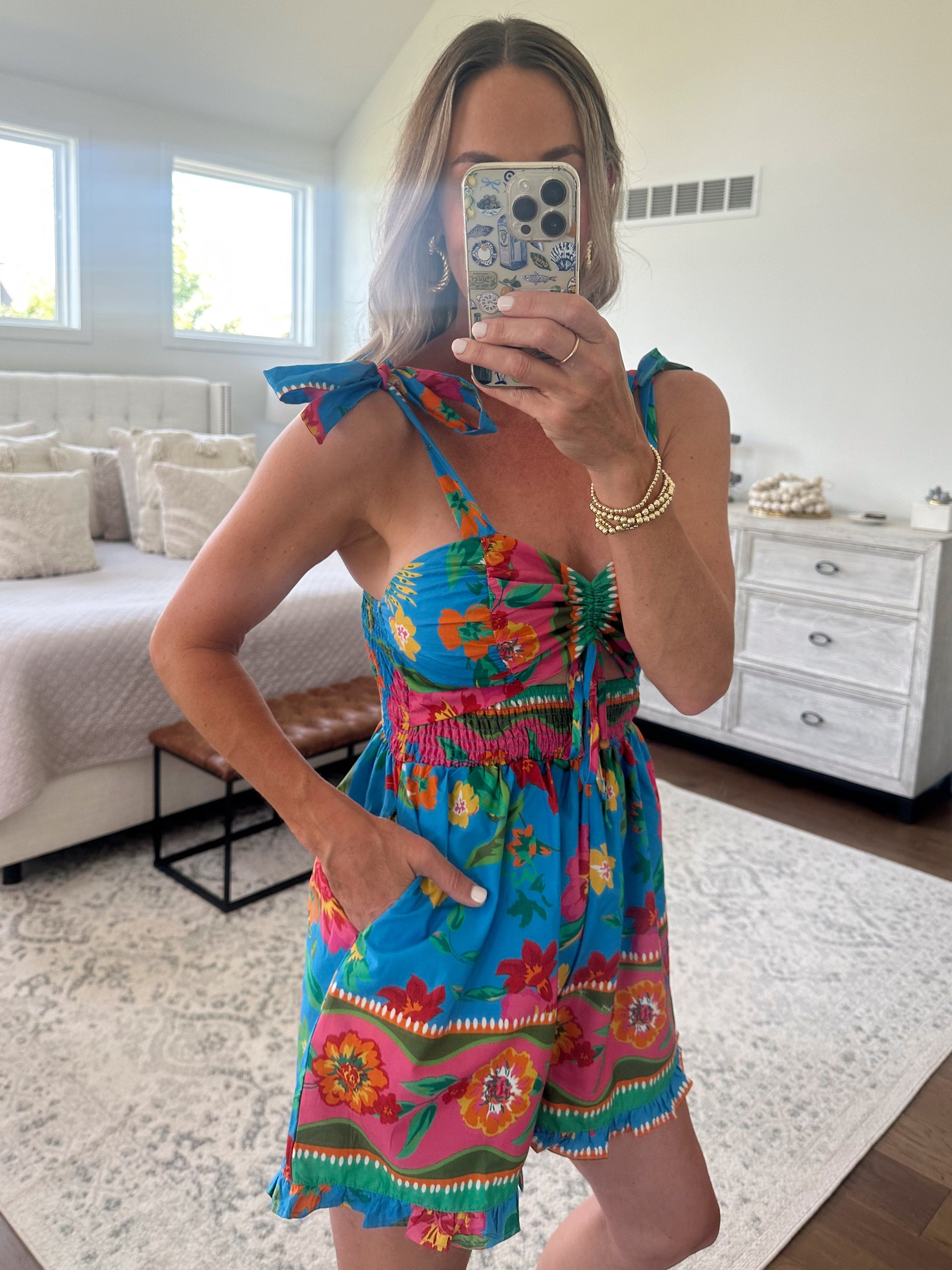 This romper has a stretchy adjustable bust, tie straps, and a smocked waist. The fit is true to size. Brooke is 5'10, a size 4, and wearing a small. Lined.