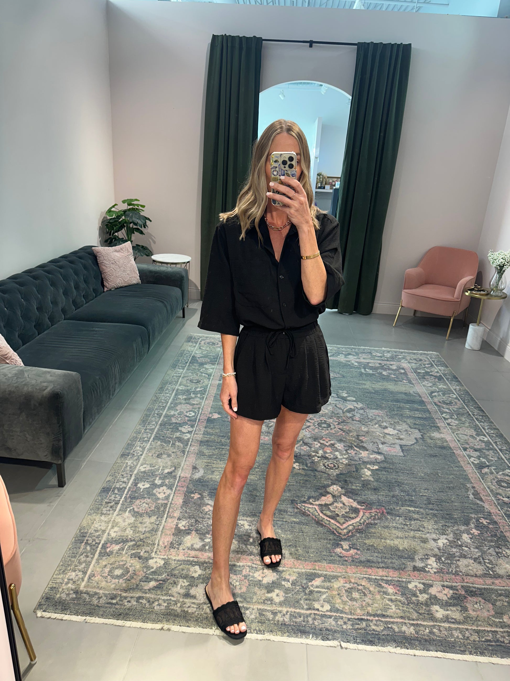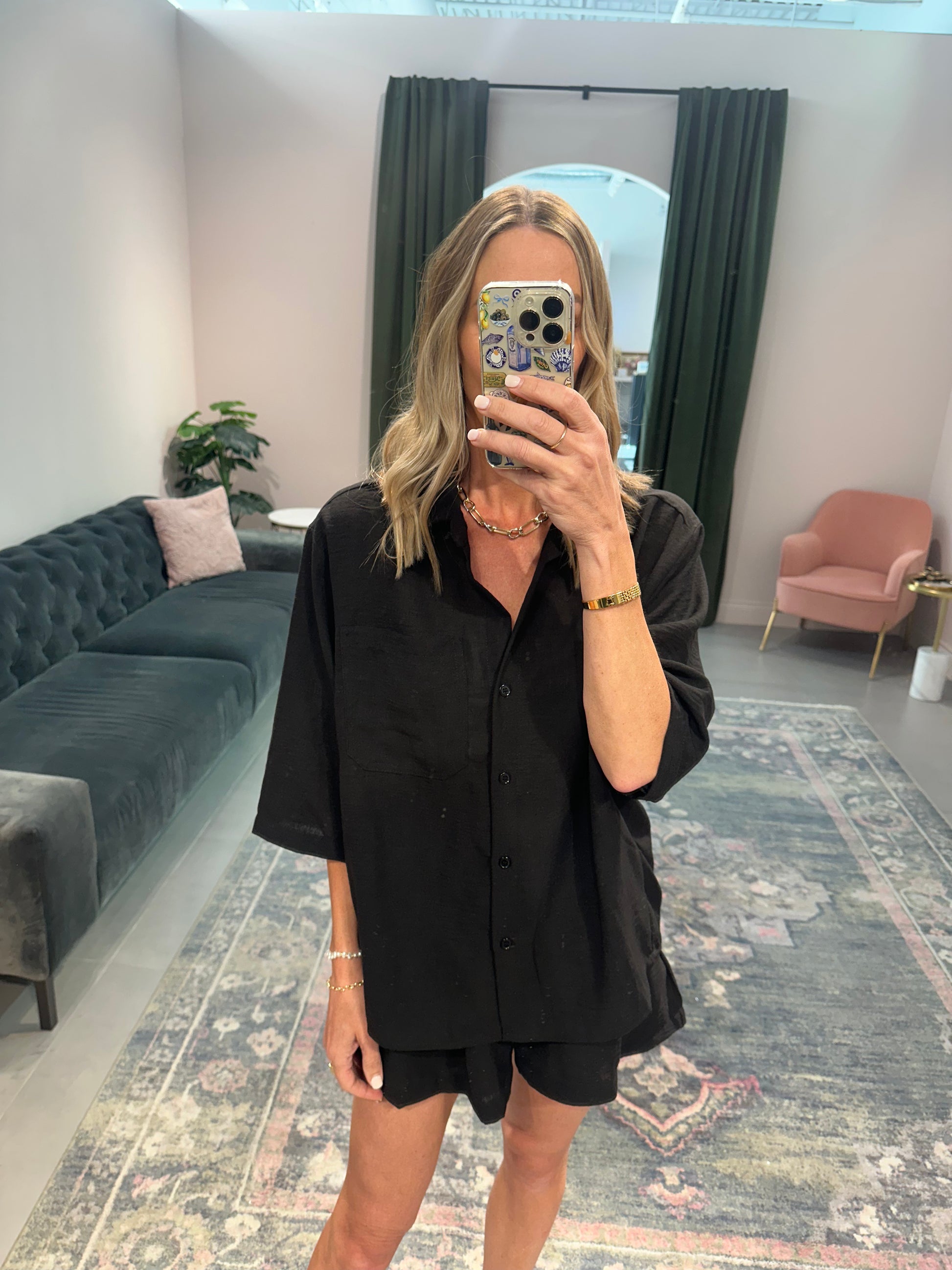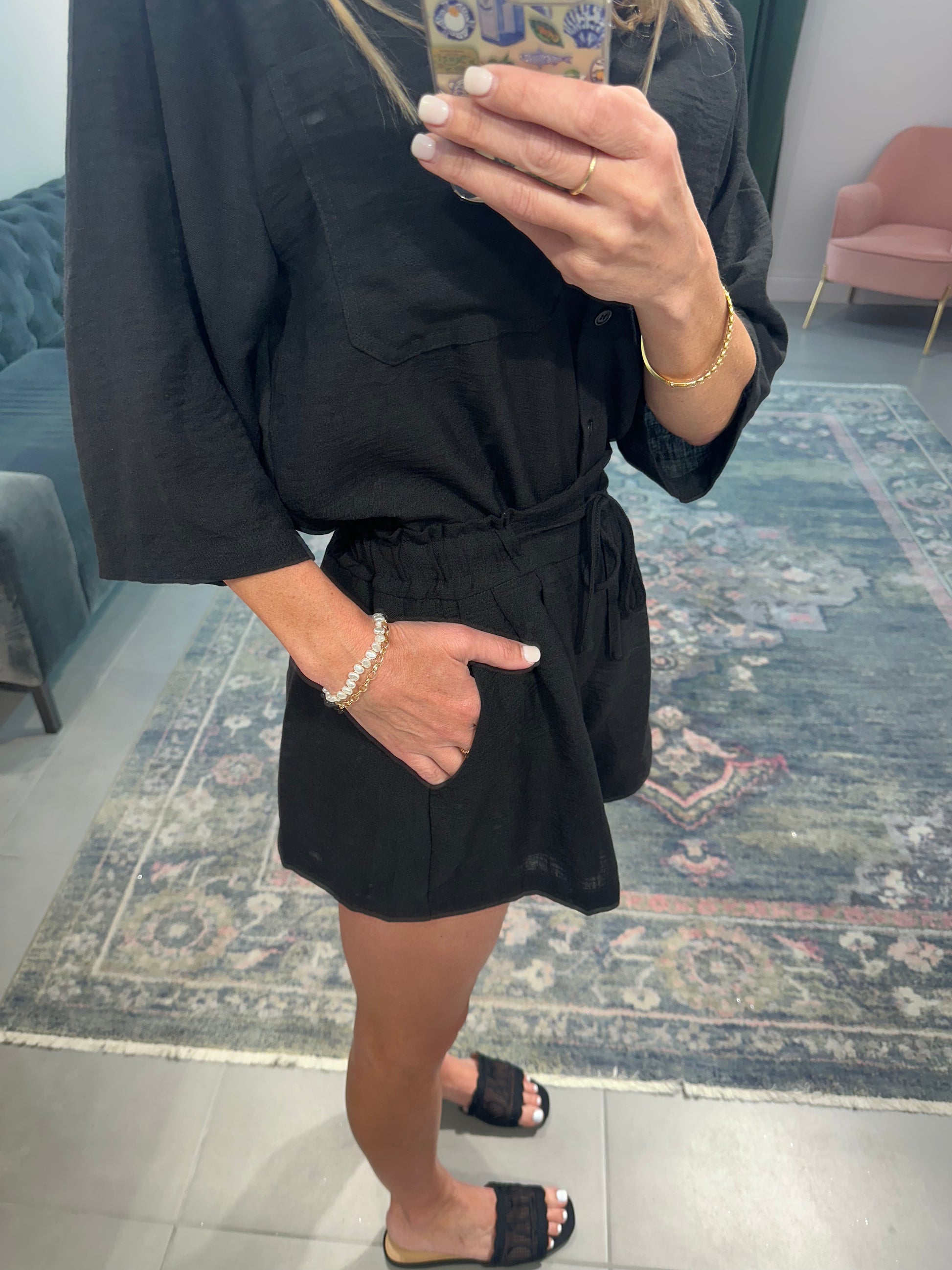 2 piece woven set in black. This comes with a flowy oversized top with functional buttons, and lined shorts with a stretchy drawstring waist and hook and eye closure.