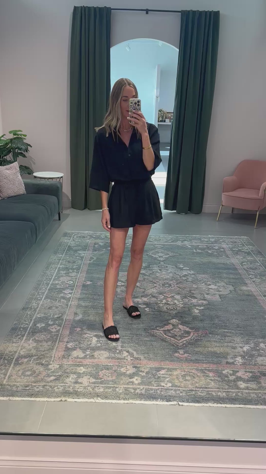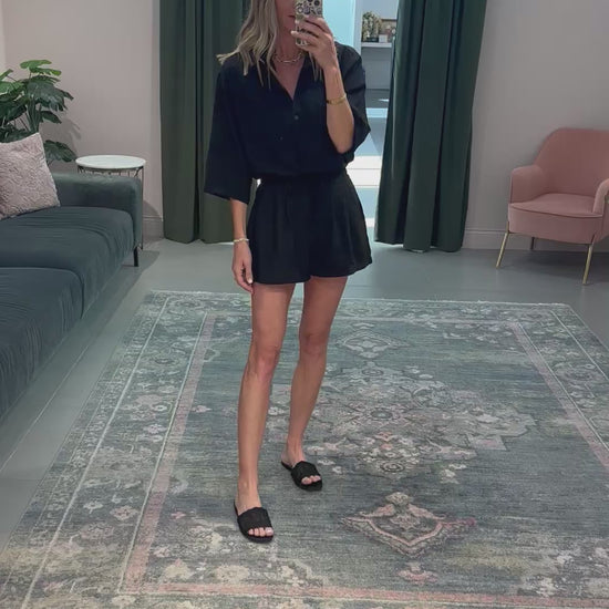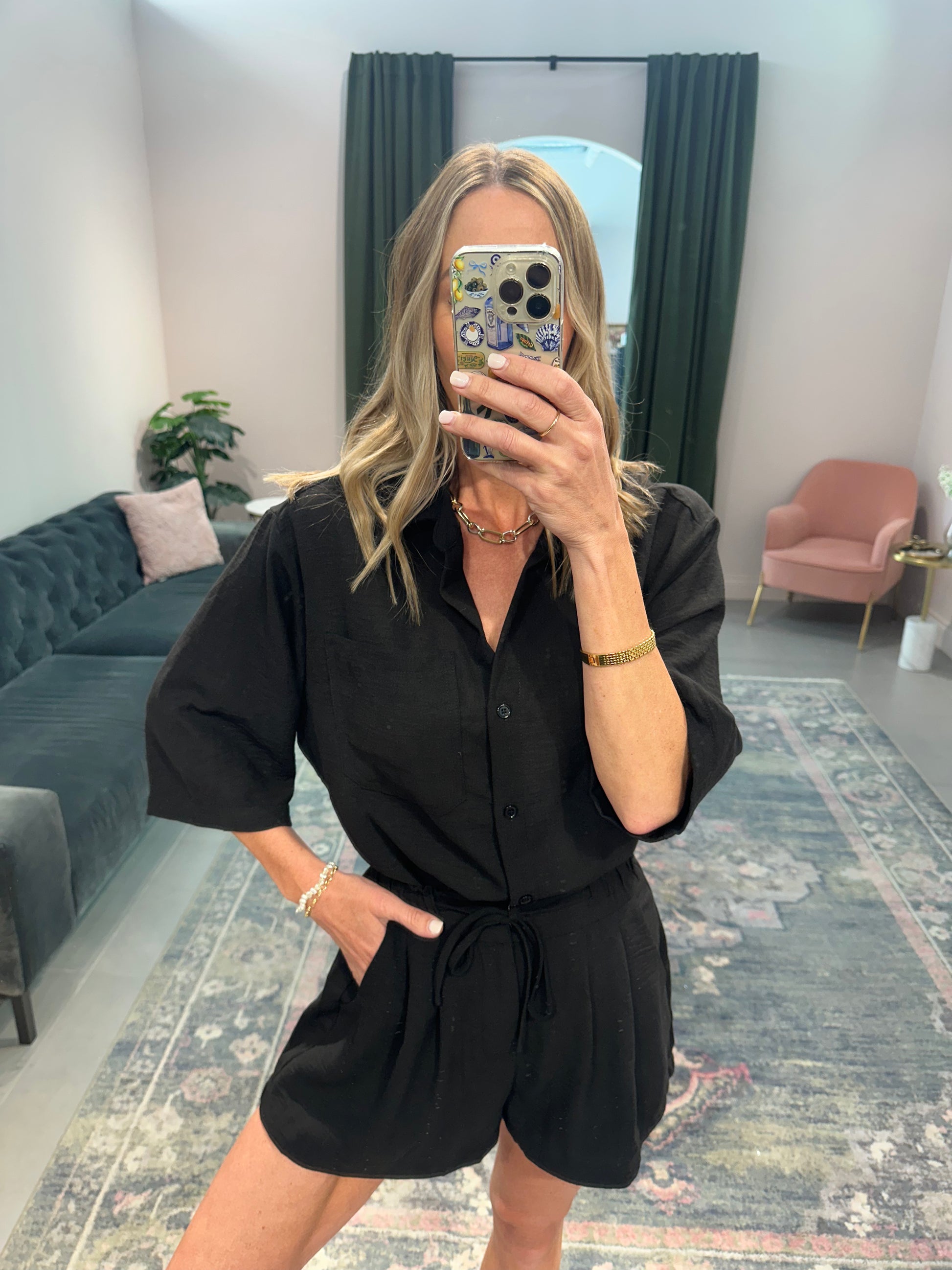 2 piece woven set in black. This comes with a flowy oversized top with functional buttons, and lined shorts with a stretchy drawstring waist and hook and eye closure.